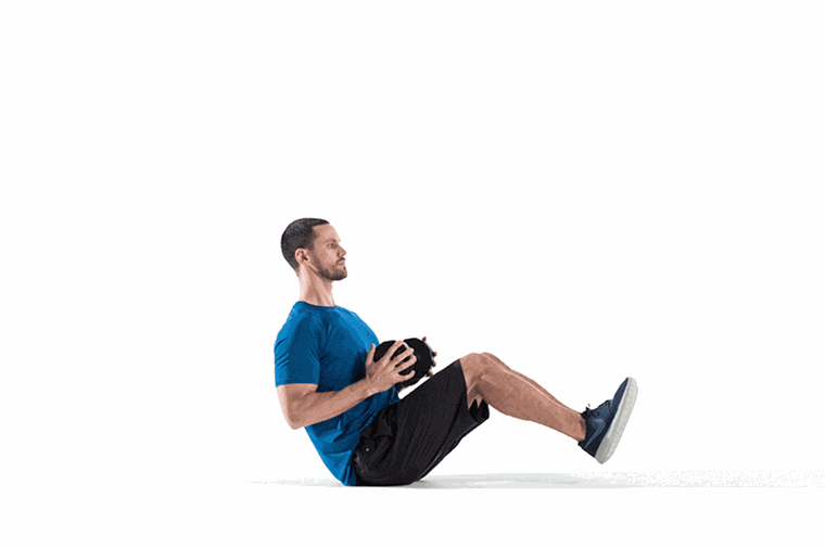 Στηρίζοντας το σώμα σου στους γοφούς, με τα γόνατα λυγισμένα και τα πόδια στον αέρα, στρέφεις τη μέση σου δεξιά αριστερά κρατώντας τον αλτήρα μπροστά από το στήθος.