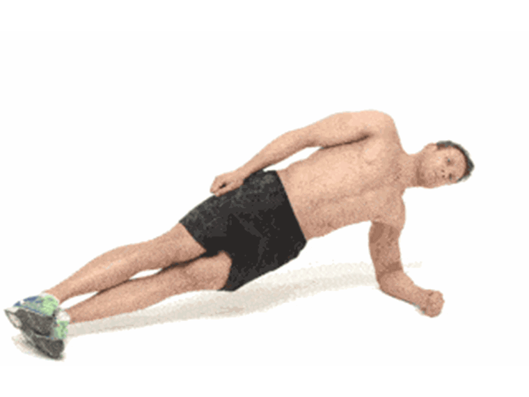 Στηρίζοντας το σώμα στο αντιβράχιο και στο εξωτερικό μέρος του ποδιού, δημιουργείς μια ευθεία από τον αυχένα έως τα πόδια, με την σπονδυλική στήλη σταθερή και τον πυρήνα ενεργοποιημένο. 30 δευτερόλεπτα για κάθε πλευρά.