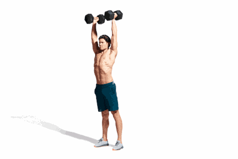Αλτήρες στους ώμους, ημικάθισμα, εκτίναξη χεριών πάνω από το κεφάλι, όλα σε μια συνεχή ρυθμική ροή.