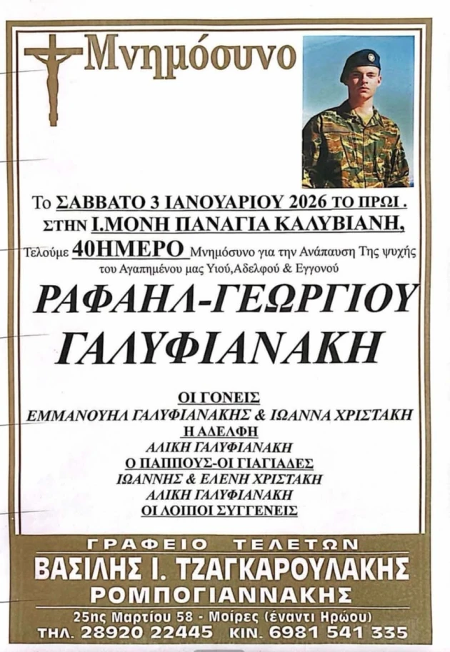 Σαράντα ημέρες συμπληρώνονται από το τραγικό δυστύχημα που στοίχισε τη ζωή στον 19χρονο Ραφαήλ Γεωργίου Γαλυφιανάκη, με την οικογένεια και την τοπική κοινωνία να τιμούν τη μνήμη του το Σάββατο 3 Ιανουαρίου 2026 στην Ιερά Μονή Παναγίας Καλυβιανής