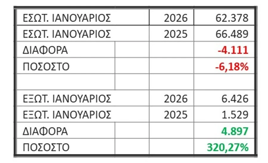 Την ίδια ώρα, στις πτήσεις εσωτερικού καταγράφεται μία μικρή μείωση. Πιο συγκεκριμένα, φέτος τον Ιανουάριο διακινήθηκαν 62.378 επιβάτες, ενώ τον αντίστοιχο μήνα του 2025 διακινήθηκαν 66.489 με το ποσοστό μείωσης να φτάνει τα 6.18%.