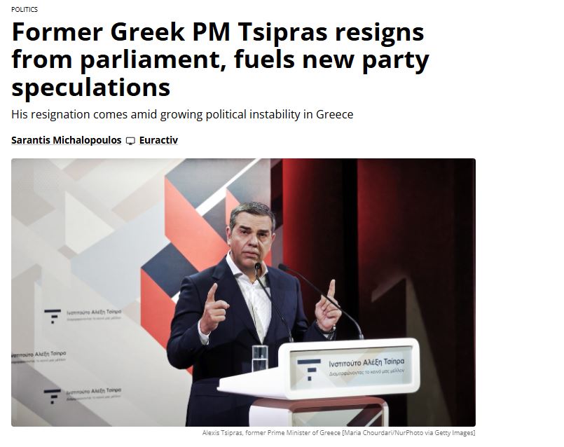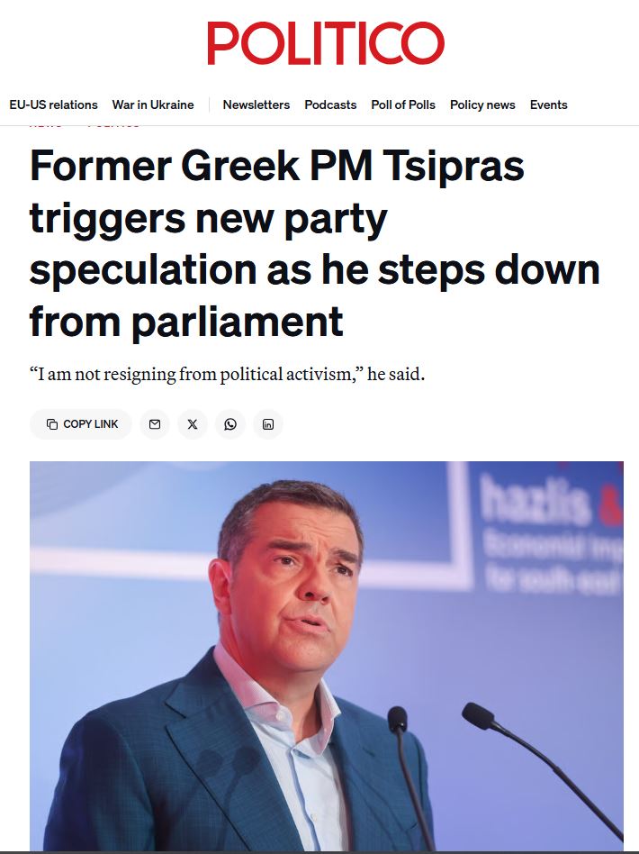 Το Politico έγραψε: «Ο πρώην πρωθυπουργός της Ελλάδας Τσίπρας πυροδοτεί νέες εικασίες καθώς αποχωρεί από το κοινοβούλιο» παρουσιάζοντας ένα εκτενές ρεπορτάζ περιλαμβάνοντας στιγμές της πολιτικής σταδιοδρομίας του πρώην πρωθυπουργού από την ημέρα που ανέλαβε την ηγεσία του ΣΥΡΙΖΑ μέχρι το καλοκαίρι του 2023 που αποφάσισε να παραιτηθεί από την προεδρία του κόμματος που ανέδειξε σε κυβέρνηση το 2015.