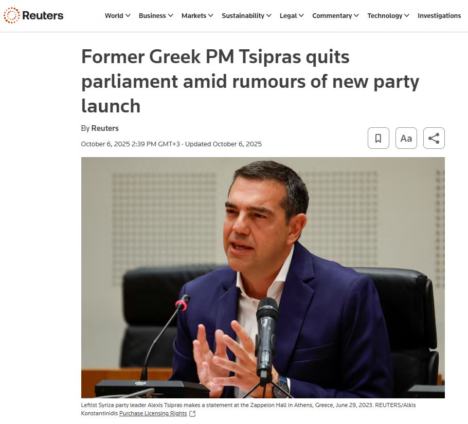 «Ο πρώην πρωθυπουργός Τσίπρας εγκαταλείπει το κοινοβούλιο εν μέσω φημών για την ίδρυση νέου κόμματος» είναι ο τίτλος του Reuters που σχολιάζει πως «έγινε παγκοσμίως γνωστός κατά τη διάρκεια των σκληρών διαπραγματεύσεων της Ελλάδας με τους διεθνείς δανειστές για το τρίτο και τελευταίο οικονομικό πακέτο διάσωσης, το οποίο έληξε το 2018».