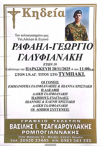 Στο πένθος έχει βυθιστεί το Τυμπάκι από τον αδόκητο χαμό του Ραφαήλ Γαλυφιανάκη