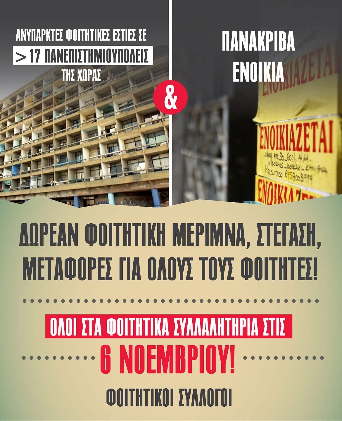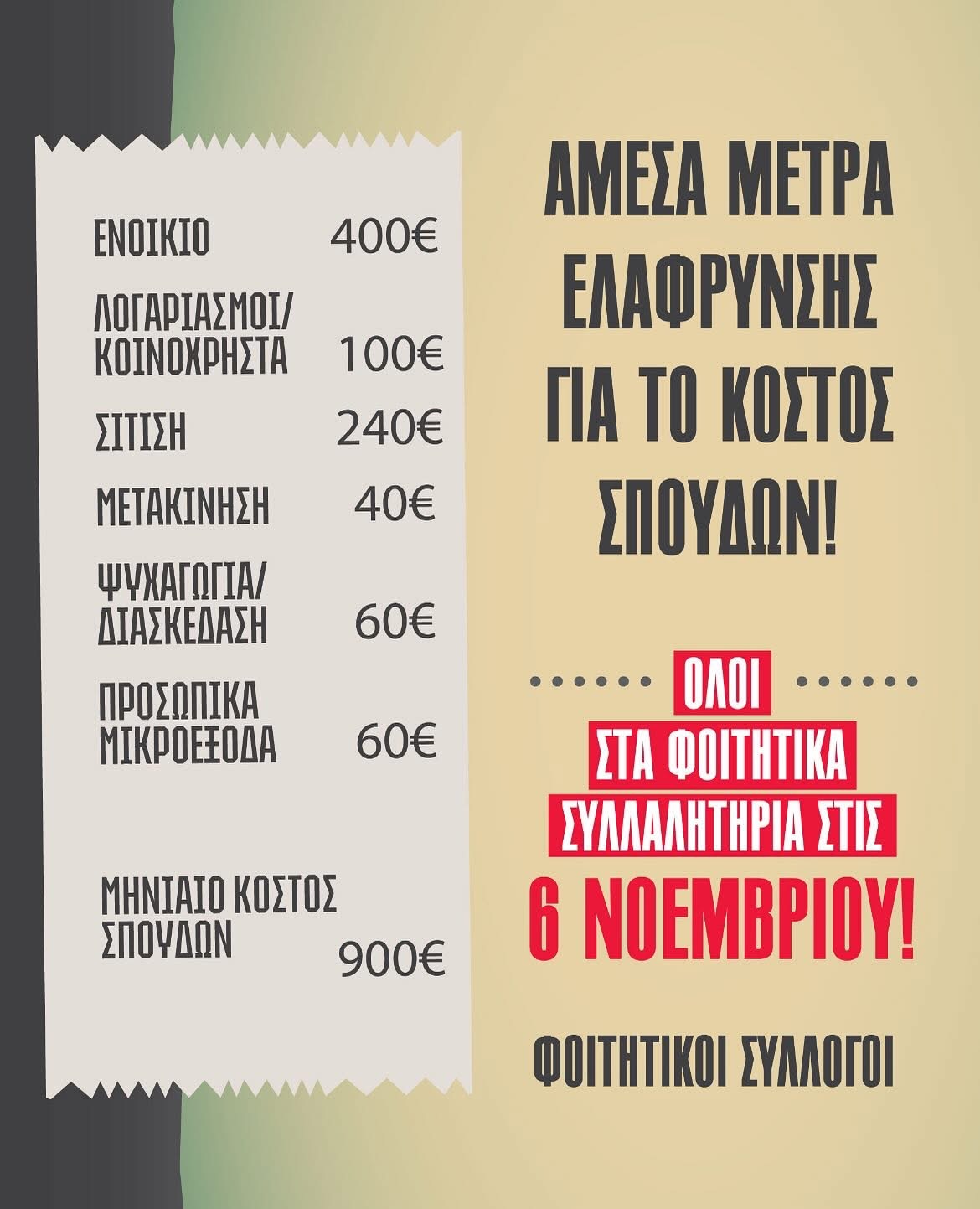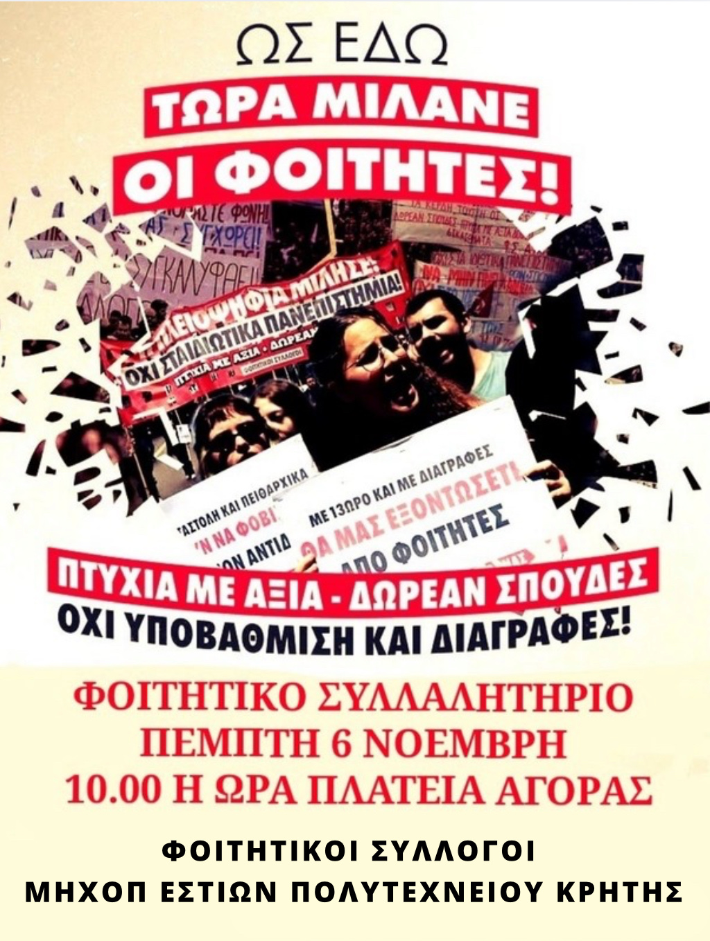 Για αυτούς τους λόγους οι Φοιτητικοί Σύλλογοι που συνυπογράφουμε το κοινό αυτό ψήφισμα παίρνουμε την πρωτοβουλία να οργανώσουμε σειρά αγωνιστικών κινητοποιήσεων κλιμακώνοντας με συλλαλητήρια την Πέμπτη 6 Νοέμβρη σε όλες τις πόλεις της χώρας μαζί με τους μαθητές!