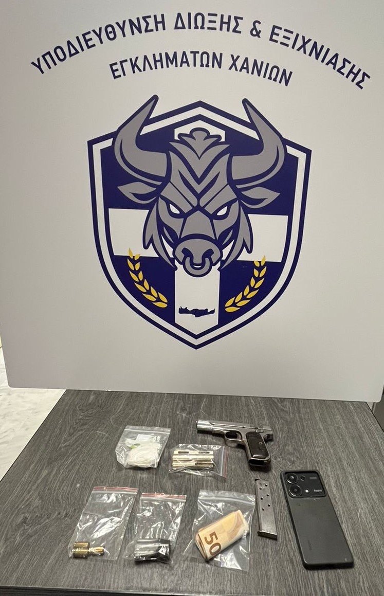 Συνελήφθη σήμερα (25.02.2026) από αστυνομικούς του Τμήματος Δίωξης Ναρκωτικών της Υποδιεύθυνσης Δίωξης Ναρκωτικών Χανίων ημεδαπός κατηγορούμενος για παραβάσεις νομοθεσίας περί ναρκωτικών και όπλων στα Χανιά.