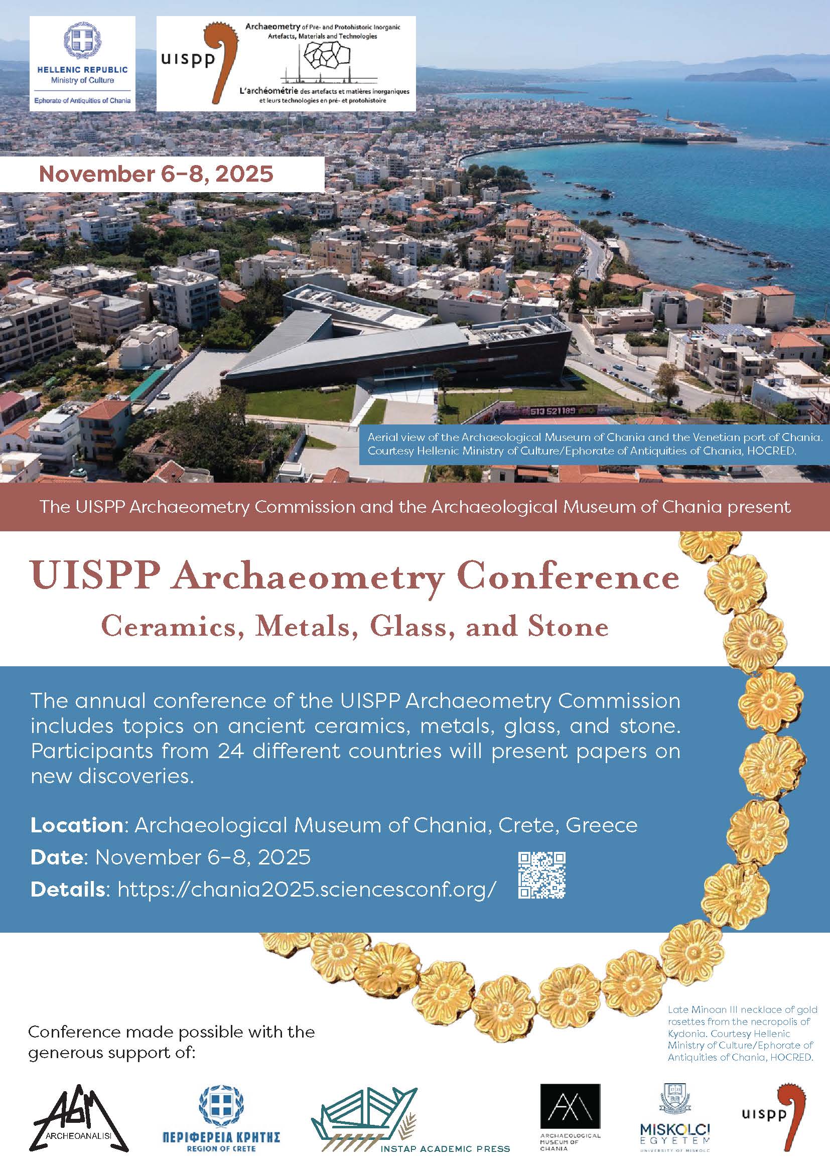 Η Εφορεία Αρχαιοτήτων Χανίων συνδιοργανώνει και φιλοξενεί, από τις 6 έως τις 8 Νοεμβρίου 2025 στο Αρχαιολογικό Μουσείο Χανίων, το Διεθνές Συνέδριο Αρχαιομετρίας για την Πέτρα, το Γυαλί, τα Κεραμικά και τα Μέταλλα, το οποίο αποτελεί το ετήσιο Colloquium Αρχαιομετρίας της Επιτροπής της UISPP (Union Internationale des Sciences Préhistoriques et Protohistoriques) για την Αρχαιομετρία Προϊστορικών και Πρωτοϊστορικών Ανόργανων Αντικειμένων, Υλικών και των Τεχνολογιών τους.