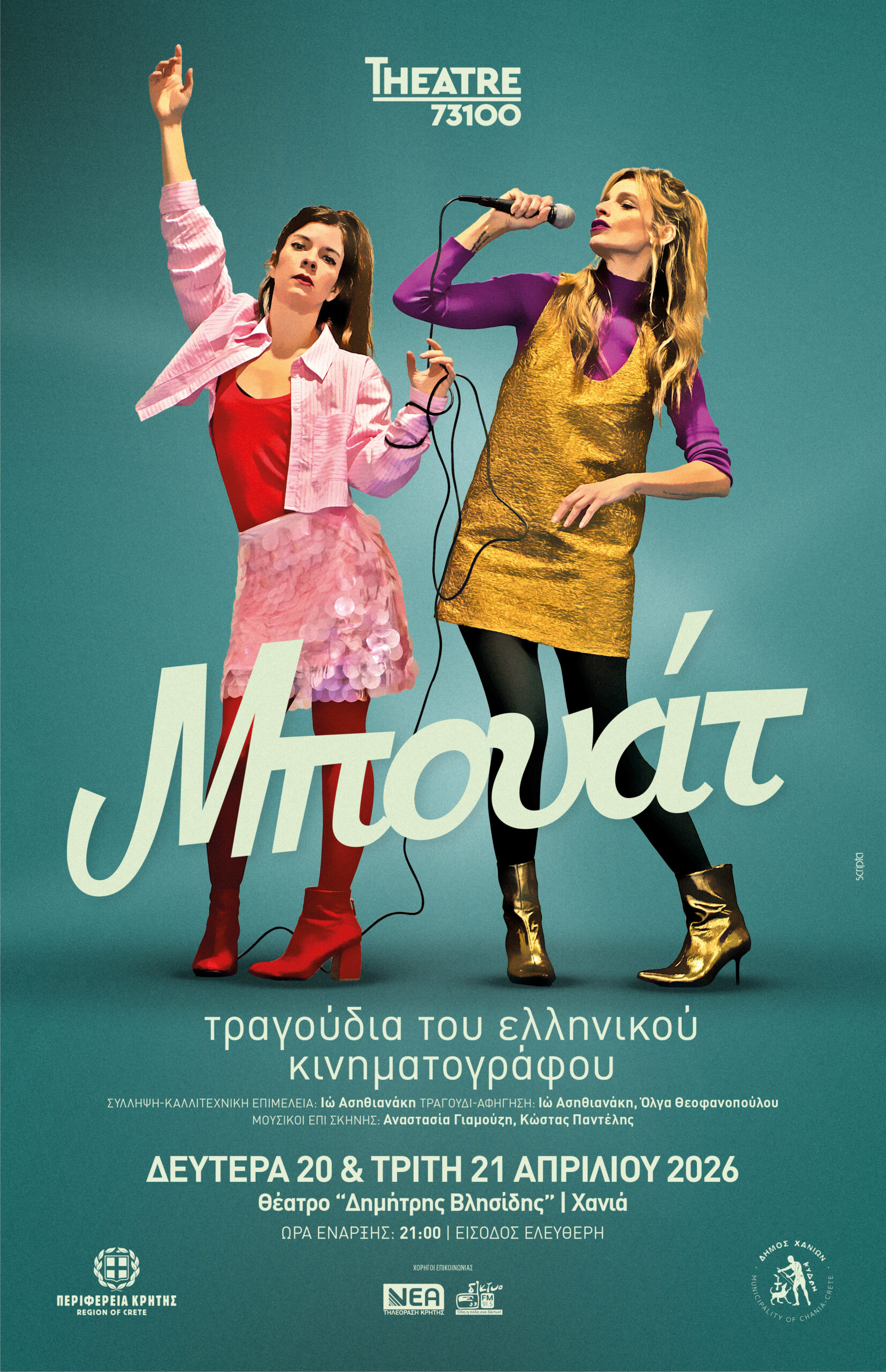 Η Περιφερειακή Ενότητα Χανίων προσφέρει, με την αρωγή του Δήμου Χανίων, δύο (2) παραστάσεις της Μουσικοθεατρικής Παραγωγής «ΜΠΟΥΑΤ», τη Δευτέρα 20 Απριλίου 2026 και την Τρίτη 21 Απριλίου 2026, ώρα 21.00, στο θέατρο «Δημήτρης Βλησίδης».