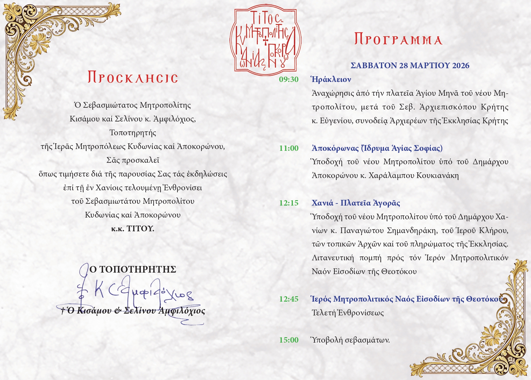 Το Σάββατο 28 Μαρτίου 2026 στις 12:15 θα πραγματοποιηθεί η επίσημη υποδοχή του νέου Ποιμενάρχη της πόλης, Σεβασμιωτάτου Μητροπολίτη Κυδωνίας και Αποκορώνου κ. Τίτου.