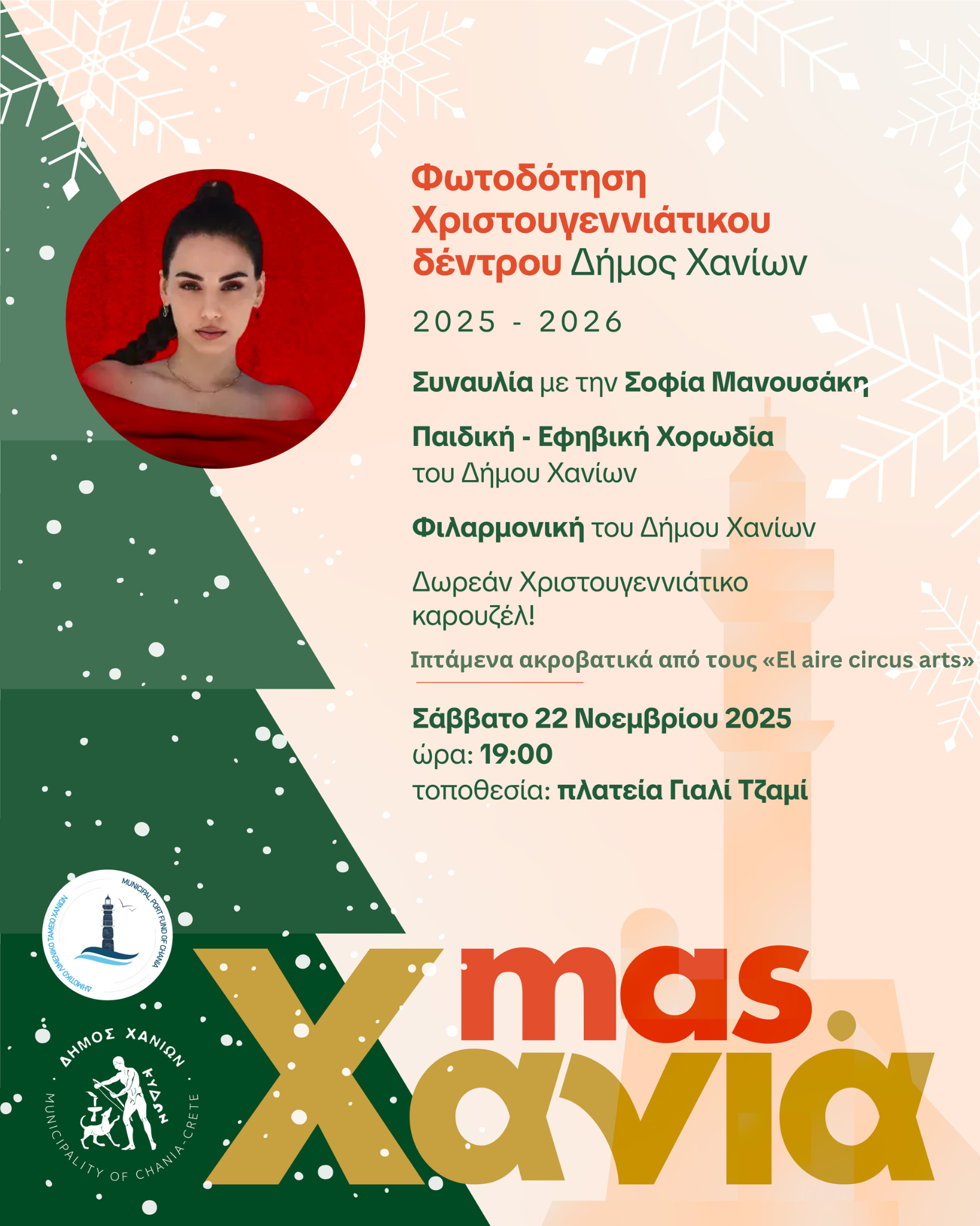 Η φωτοδότηση του Χριστουγεννιάτικου δέντρου στην πλατεία δίπλα από το Γιαλί Τζαμί θα πραγματοποιηθεί το Σάββατο 22 Νοεμβρίου 2025, στις 19:00, δίνοντας το σύνθημα για την επίσημη έναρξη των εορταστικών εκδηλώσεων που διοργανώνει ο Δήμος Χανίων.