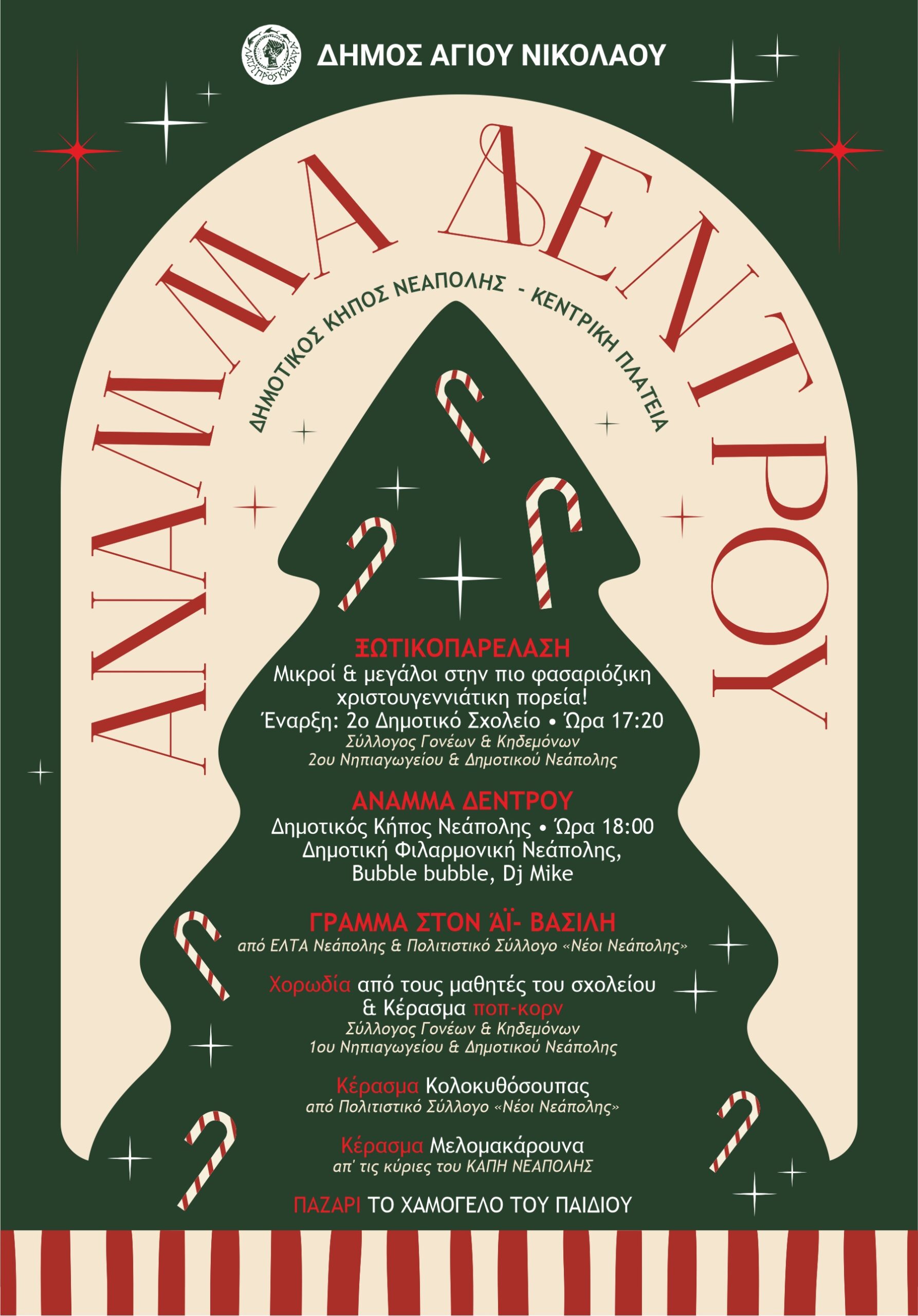 Ο Δήμος Αγίου Νικολάου υποδέχεται την πιο μαγική εποχή του χρόνου με τη φωταγώγηση του Χριστουγεννιάτικου Δέντρου την Κυριακή 30 Νοεμβρίου 2025 στο Δημοτικό Κήπο της Νεάπολης.
