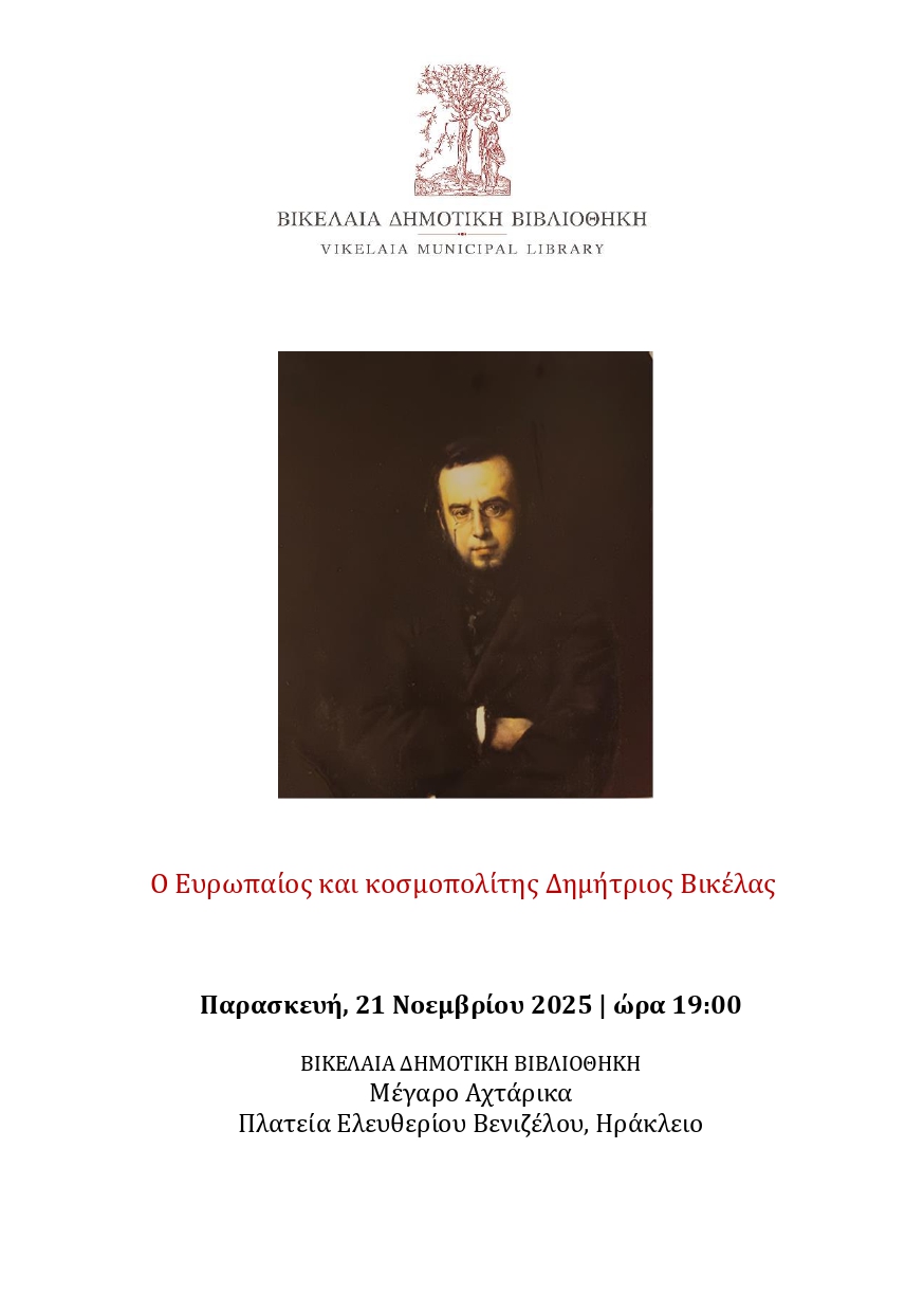 Δήμος Ηρακλείου:«Ο Ευρωπαίος και κοσμοπολίτης Δημήτριος Βικέλας» το θέμα εσπερίδας στη Βικελαία Δημοτική Βιβλιοθήκη
