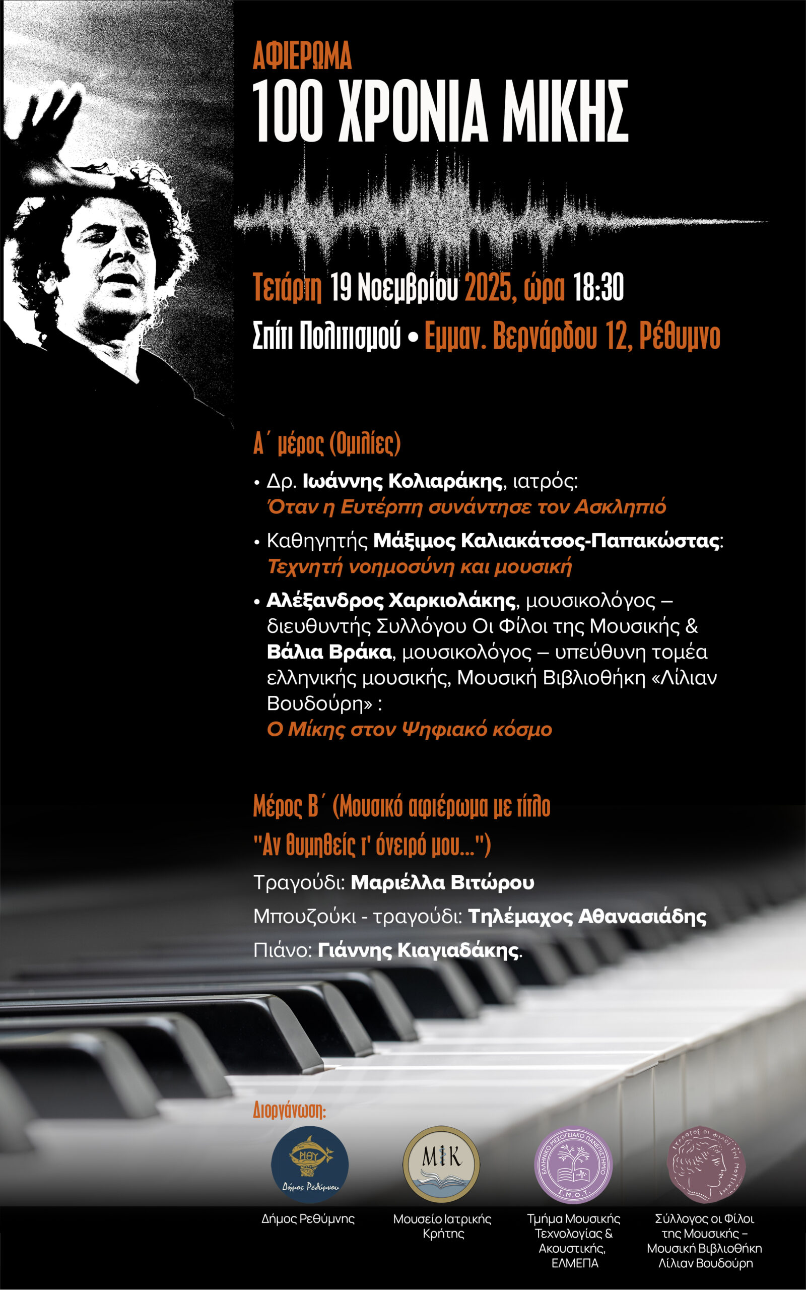 Διεπιστημονική εκδήλωση στο πλαίσιο εορτασμού των 100 χρόνων από τη γέννηση του Μίκη Θεοδωράκη, συνδιοργανώνουν το Μουσείο Ιατρικής Κρήτης της Ιατρικής Σχολής του Πανεπιστημίου Κρήτης με θερμούς υποστηρικτές το Τμήμα Παιδείας και το Τμήμα Πολιτισμού του Δήμου Ρεθύμνης, το Τμήμα Μουσικής Τεχνολογίας και Ακουστικής της Σχολής Μουσικής και Οπτικοακουστικών Τεχνολογιών του ΕΛΜΕΠΑ και το Σύλλογο «Οι Φίλοι της Μουσικής».