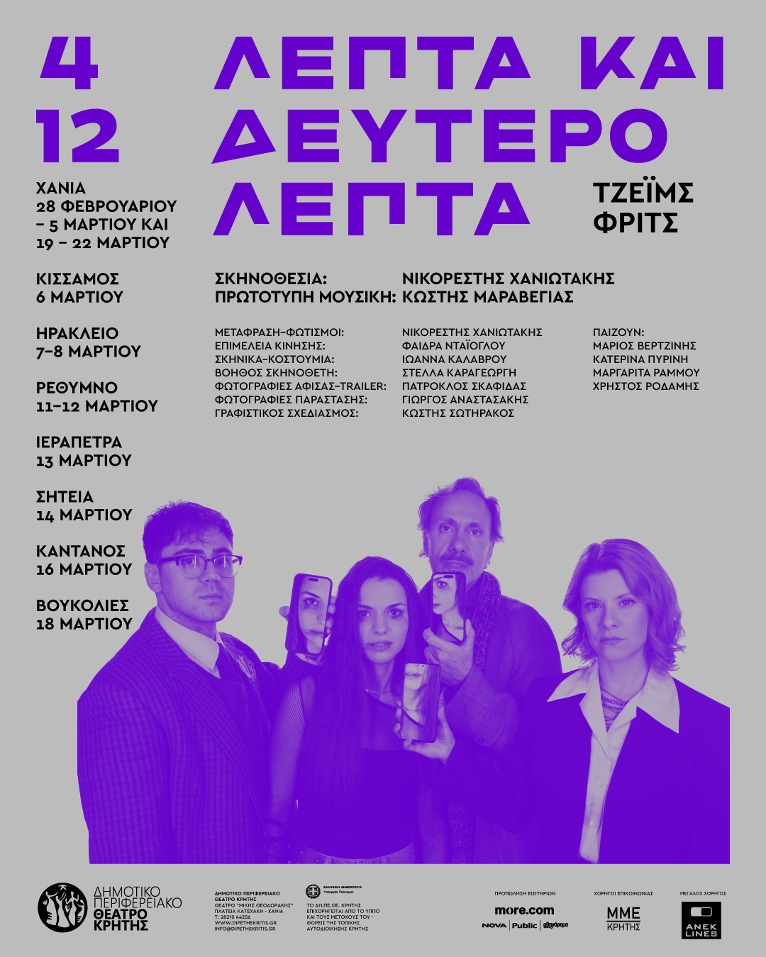 ΔΗΠΕΘΕ Κρήτης : “4 Λεπτά και 12 Δευτερόλεπτα” , σε σκηνοθεσία Νικορέστη Χανιωτάκη και πρωτότυπη μουσική Κωστή Μαραβέγια