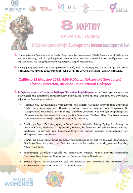 Την ίδια ημέρα θα πραγματοποιηθεί εκδήλωση από το «Γυναικείο Σύλλογο Ελληνίδων Ρομά-Μητέρα», το απόγευμα, 6:00 π.μ. έως 9:00 μ.μ. στο Πολιτιστικό Συνεδριακό Κέντρο Ηρακλείου, στην Αίθουσα του Πειραματικού Θεάτρου. Στο πλαίσιο της εκδήλωσης θα γίνει προβολή του εθνογραφικού ντοκιμαντέρ «Το κορίτσι γυναίκα» (σκηνοθεσία Ευαγγελία Γούλα) που γυρίστηκε στο Ηράκλειο Κρήτης, στον καταυλισμό των Τσιγγάνων Ν. Αλικαρνασσού και εστιάζει στη θέση της Τσιγγάνας γυναίκας.
