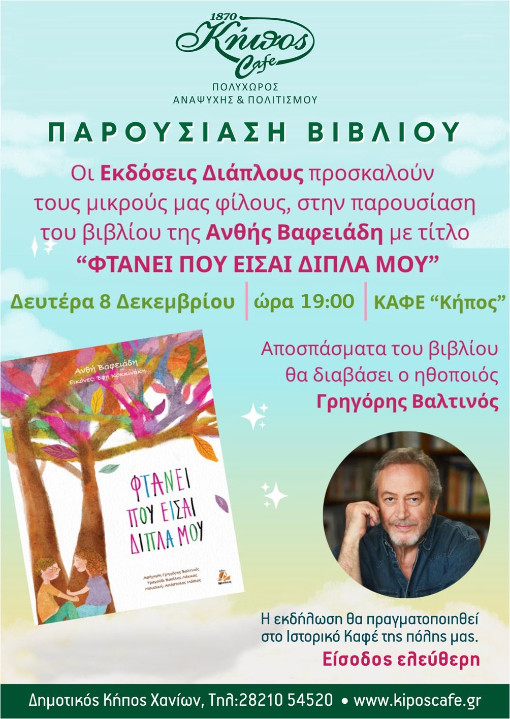 Η εκδήλωση θα πραγματοποιηθεί τη Δευτέρα 8 Δεκεμβρίου, στις 19:00, στο ιστορικό Café “Κήπος” στον Δημοτικό Κήπο Χανίων.