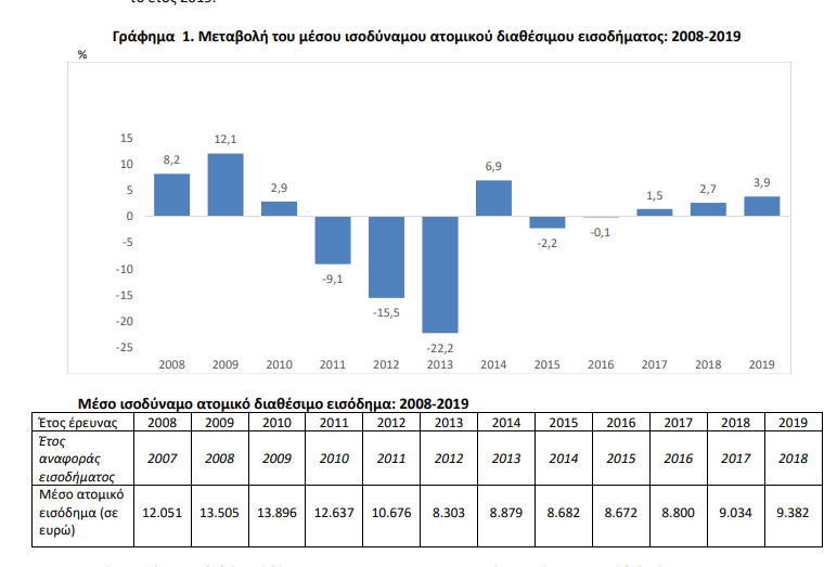 Το μέσο ισοδύναμο ατομικό διαθέσιμο εισόδημα ανήλθε το 2019 σε 9.382 ευρώ, υψηλότερο κατά 3,9% από το προηγούμενο έτος.