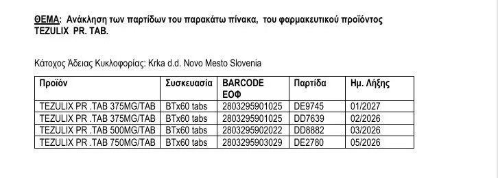 Ο ΕΟΦ με ανακοίνωσή του γνωστοποιεί την ανάκληση παρτίδων του φαρμάκου TEZULIX PR. TAB λόγω προβλημάτων που προέκυψαν κατά την μετάβαση από την πώληση των τεμαχίων του προϊόντος που φέρουν ταινίες γνησιότητας στην πώληση αυτών που φέρουν κωδικό QR. Τονίζεται ότι οι εν λόγω παρτίδες δεν φέρουν κανένα ποιοτικό πρόβλημα.