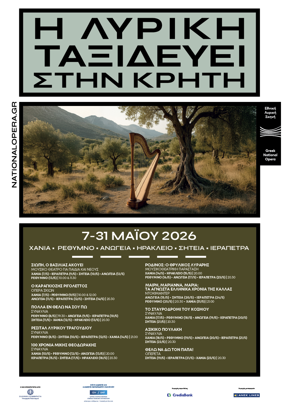 Το πρόγραμμα «Η ΕΛΣ ταξιδεύει στην Ελλάδα» υλοποιείται με τη στήριξη της δωρεάς του Ιδρύματος Σταύρος Νιάρχος (ΙΣΝ) για την ενίσχυση της καλλιτεχνικής εξωστρέφειας της Εθνικής Λυρικής Σκηνής. Η περιοδεία στην Κρήτη πραγματοποιείται με τη στήριξη του Υπουργείου Πολιτισμού και σε συνεργασία με τους τοπικούς δήμους, στο πλαίσιο του μνημονίου συνεργασίας.