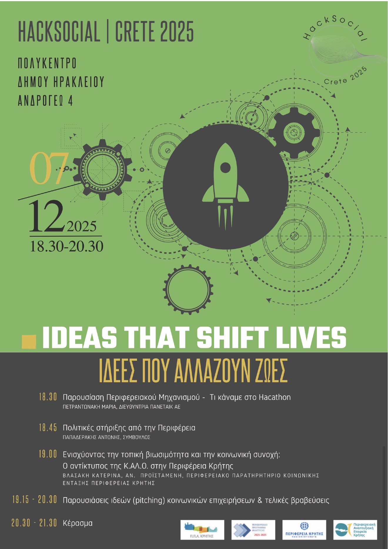 Στο πλαίσιο της βραδιάς θα παρουσιαστούν τα αποτελέσματα του εκπαιδευτικού προγράμματος HackSocial Crete 2025. Επτά (7) επιλεγμένοι φορείς κοινωνικής οικονομίας, που συμμετείχαν στο πρόγραμμα, θα παρουσιάσουν πώς εξέλιξαν την ιδέα τους σε μια καινοτόμα δράση υψηλού κοινωνικού αντίκτυπου, στοχεύοντας στη βιώσιμη τοπική ανάπτυξη. Η διαδικασία θα ολοκληρωθεί με την απονομή βραβείων στους τρεις πρώτους διαγωνιζόμενους.