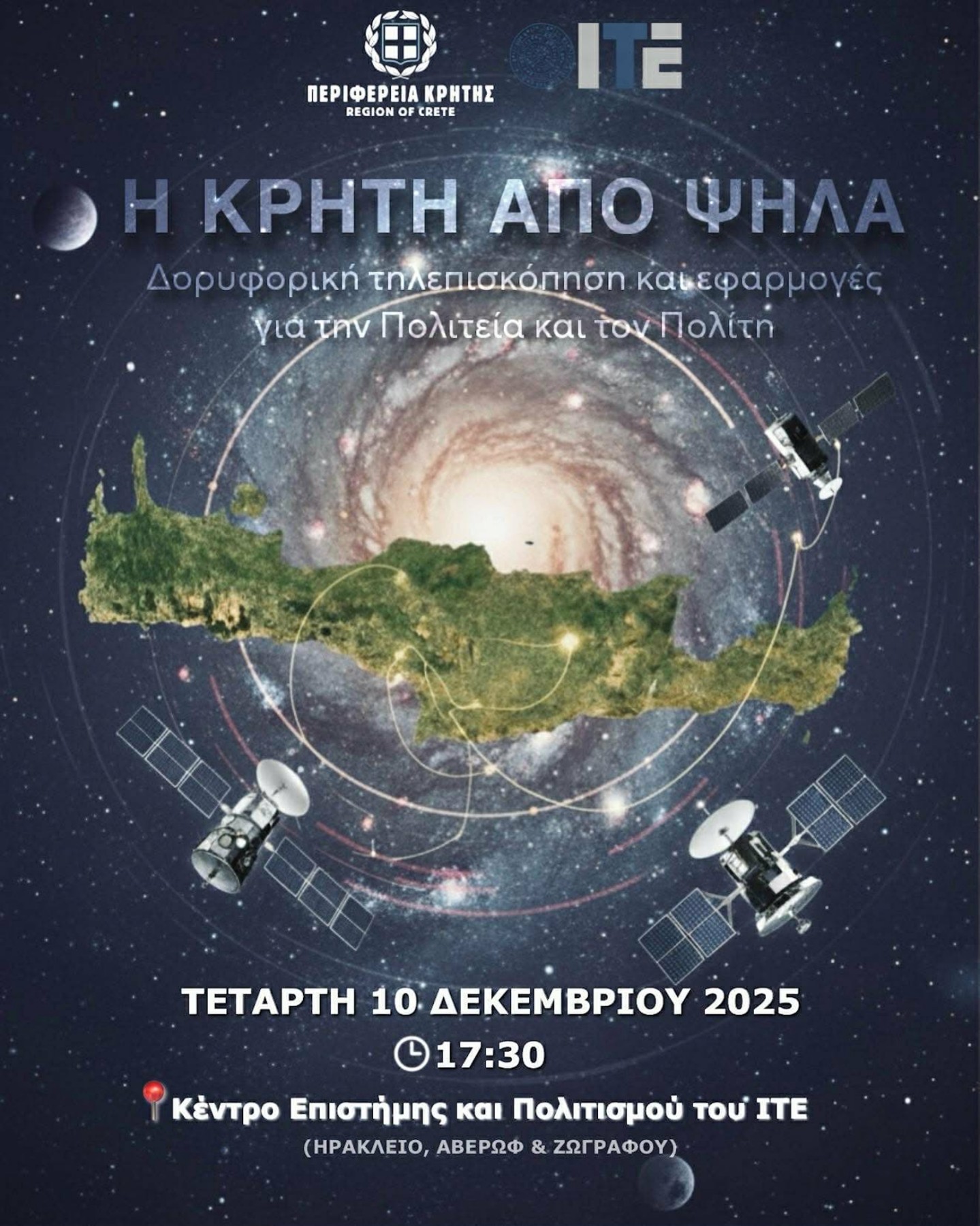 Δορυφορική τηλεπισκόπηση και εφαρμογές για την Πολιτεία και τον Πολίτη». Την εκδήλωση συνδιοργάνωσαν η Περιφέρεια Κρήτης και το Ίδρυμα Τεχνολογίας και Έρευνας, στο Κέντρο Επιστήμης και Πολιτισμού του ΙΤΕ, στο Ηράκλειο, με την συμμετοχή εκπροσώπων θεσμικών φορέων του δημοσίου τομέα και της αυτοδιοίκησης, ερευνητών και εκπροσώπων από τον χώρο των επιχειρήσεων.