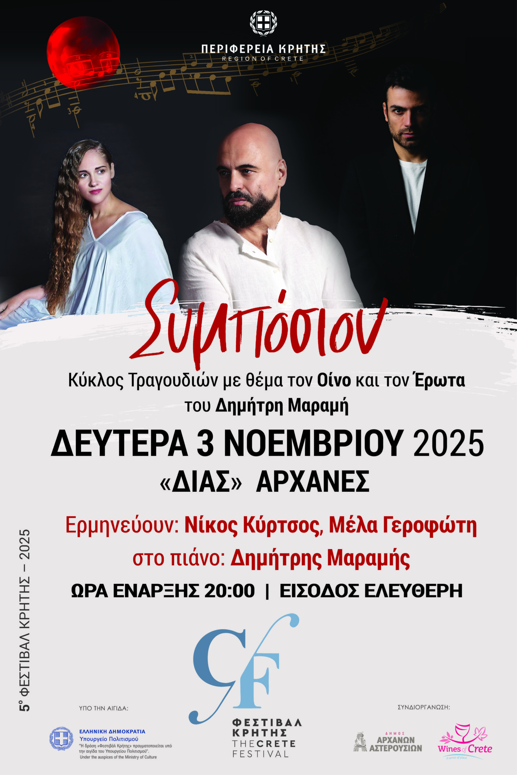 Η Περιφέρεια Κρήτης, το Δίκτυο Οινοποιών Κρήτης και ο Δήμος Αρχανών Αστερουσίων, στο πλαίσιο του «Φεστιβάλ Κρήτης» της Περιφέρειας Κρήτης, συνδιοργανώνουν στον πολιτιστικό χώρο «ΔΙΑΣ» των Αρχανών, τη Δευτέρα 3 Νοεμβρίου στις 20:00, του Άϊ Γιώργη του Μεθυστή, την παρουσίαση του κύκλου τραγουδιών, για το κρασί και τον έρωτα, «Συμπόσιον» του καταξιωμένου συνθέτη Δημήτρη Μαραμή.