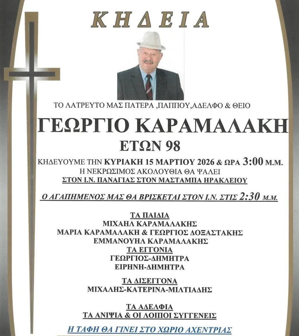 Σε ηλικία 98 ετών πέθανε ο Γιώργος Καραμαλάκης, πατέρας του πρώην Αρχηγού της ΕΛ.ΑΣ. Μιχάλη Καραμαλάκη. Η κηδεία του θα τελεστεί την Κυριακή στον Ιερό Ναό Παναγίτσας Μασταμπά, ενώ η ταφή θα γίνει στον Αχεντριά