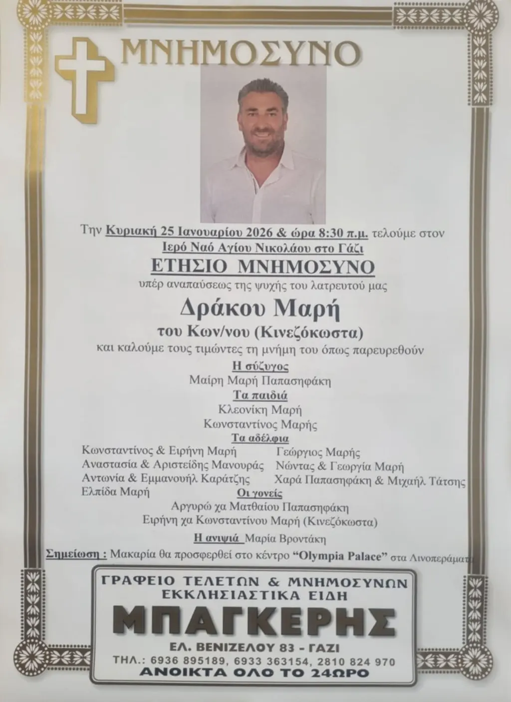Η οικογένειά του θα τελέσει μνημόσυνο υπέρ αναπαύσεως της ψυχής του την Κυριακή 25 Ιανουαρίου, στις 8:30 π.μ., στον Ιερό Ναό Αγίου Νικολάου στο Γάζι.