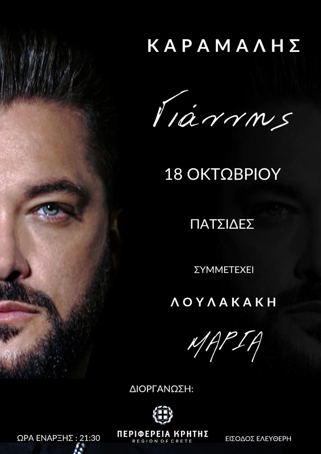 Σάββατο 18 Οκτωβρίου διασκεδάζουμε με τον Γιάννη Καράμαλη! Συμμετέχει η Μαρία Λουλακάκη. Ώρα Έναρξης 21.30.ΕΙΣΟΔΟΣ ΕΛΕΥΘΕΡΗ! Διοργάνωση Περιφέρεια Κρήτης! Και συνεχίζουμε………..