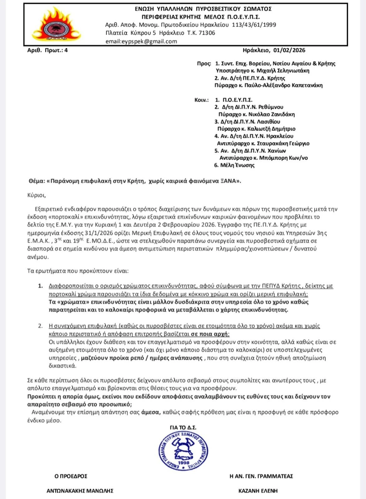 Σε καταγγελία με ιδιαίτερα αιχμηρό περιεχόμενο προς τα ανώτατα κλιμάκια του Πυροσβεστικού Σώματος προχωρά η Ένωση Υπαλλήλων Πυροσβεστικού Σώματος Κρήτης, με επιστολή που απευθύνεται στους Συντονιστές Επιχειρήσεων Βορείου, Νοτίου Αιγαίου και Κρήτης, Υποστράτηγο κ. Μιχαήλ Σεληνιωτάκη, καθώς και στον Αναπληρωτή Διοικητή ΠΕ.Π.Υ.Δ. Κρήτης, Πύραρχο κ. Παύλο-Αλέξανδρο Καπετανάκη.