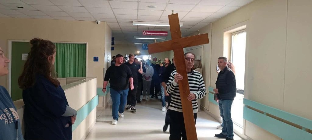 Μέσα στους διαδρόμους του Πανεπιστημιακού Νοσοκομείου Ηρακλείου, οι ασθενείς που είναι περιπατητικοί και οι συνοδοί τους περίμεναν πώς και πώς να βιώσουν κάτι από τις άγιες αυτές ημέρες της Μεγάλης εβδομάδας.