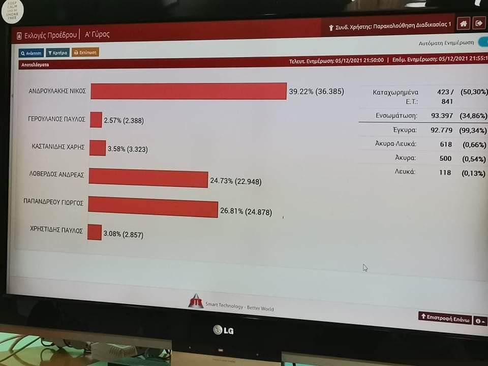 Τα πρώτα συγκεντρωτικά αποτελέσματα δόθηκαν από την Χαριλάου Τρικούπη, σύμφωνα με τα οποία προηγείται περίπου με 40% ο Νίκος Ανδρουλάκης: