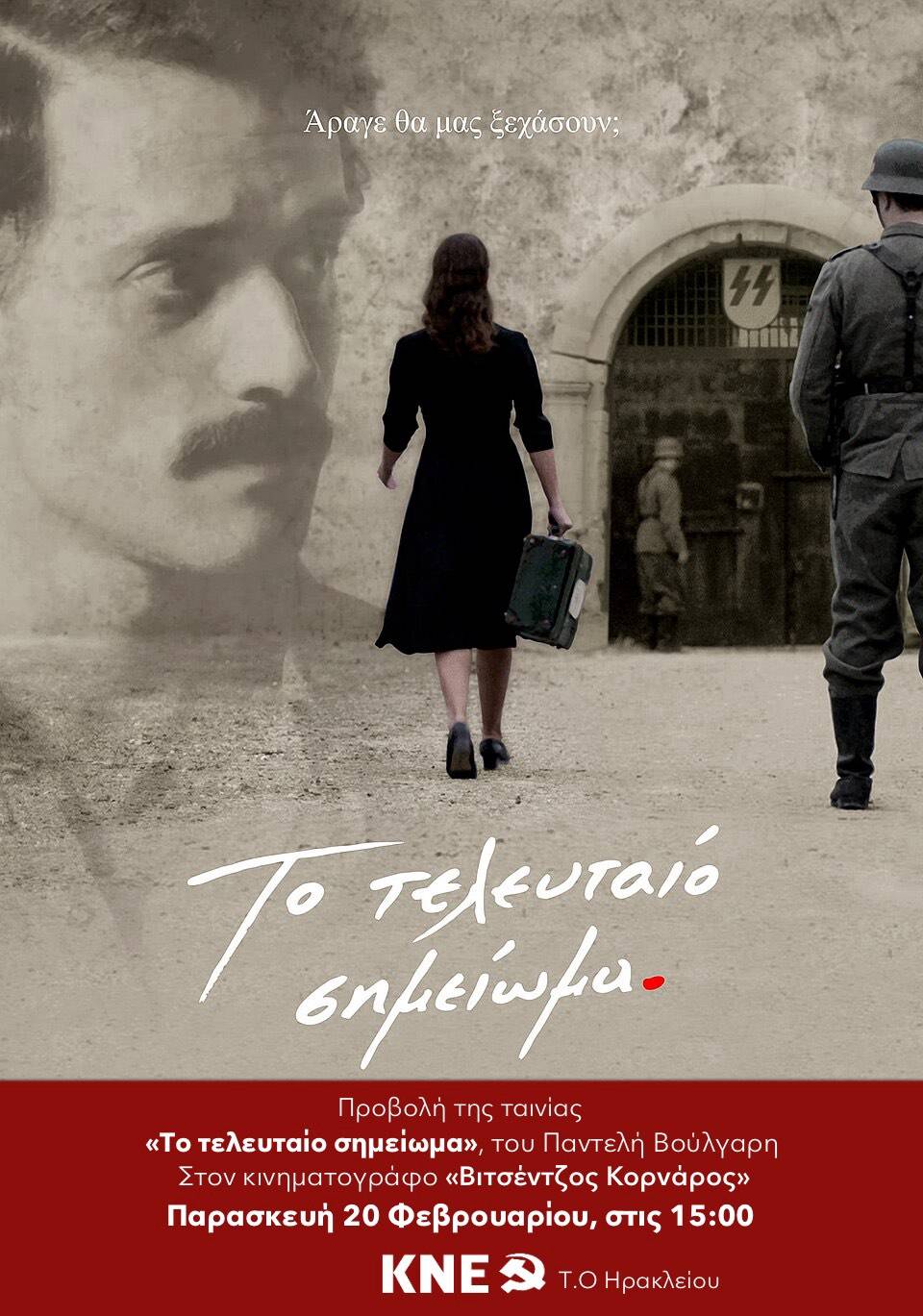 ΚΝΕ:Προβολή της ταινίας «Το τελευταίο σημείωμα» του Παντελή Βούλγαρη στον κινηματογράφο Βιντσέντζος Κορνάρος.