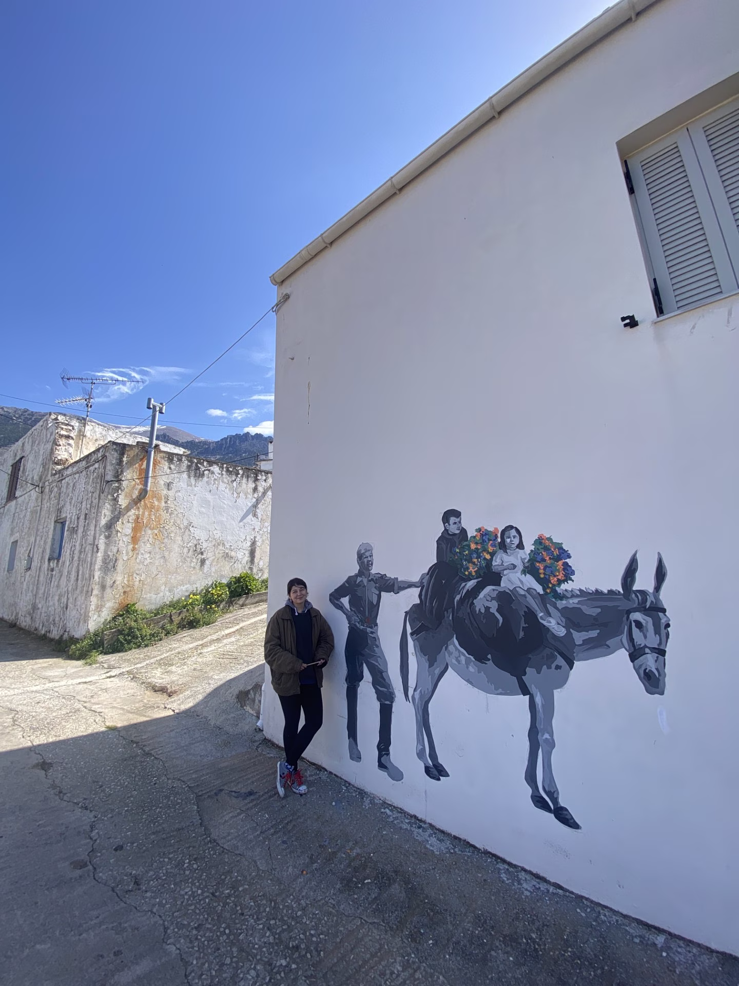Η τοιχογραφία δημιουργήθηκε με σκοπό να τιμήσει τη μορφή του παππού που έφυγε από τη ζωή, αλλά που η οικογένειά του και το χωριό ήθελαν να «κρατήσουν» εκεί, στο σπίτι του. Απεικονίζοντας τον Παππού Μανώλη με το γαϊδουράκι του και τα εγγόνια του φορτωμένα λουλούδια, το έργο συμβολίζει την επιστροφή του αγαπημένου προσώπου στο οικείο του περιβάλλον, φέρνοντας μαζί του χρώμα, ζωή και ελπίδα.