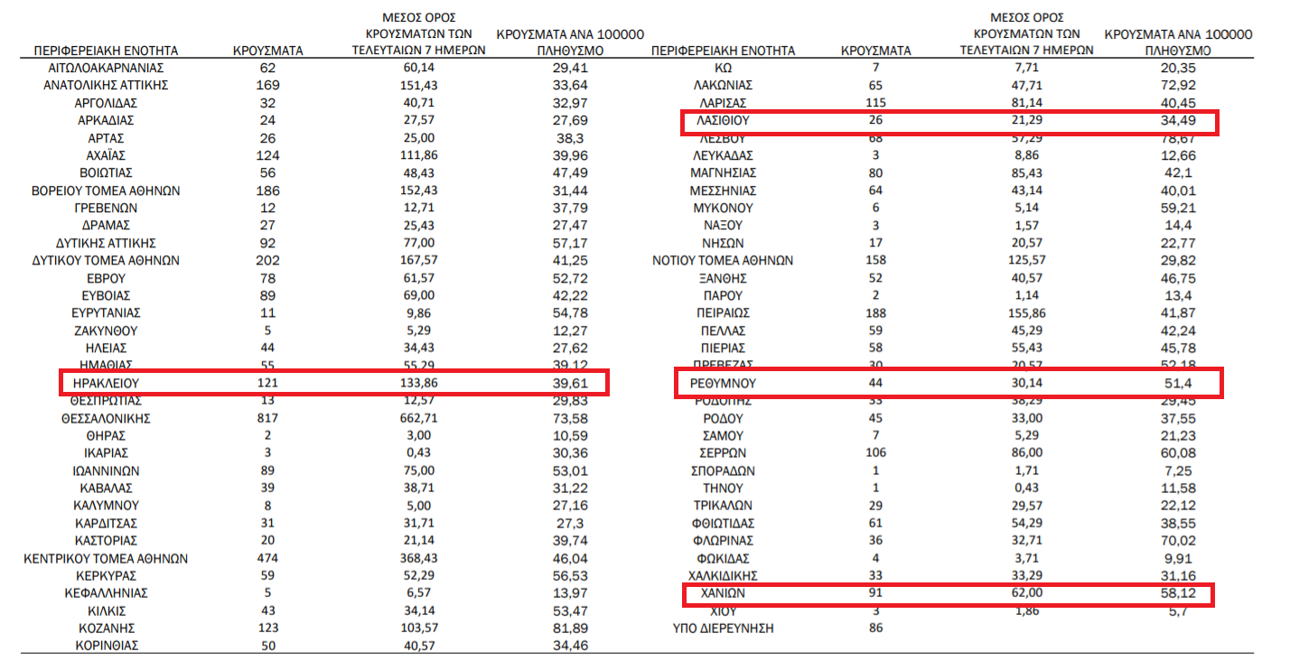 Σύμφωνα με τα στοιχεία της ημερήσιας έκθεσης επιδημιολογικής επιτήρησης τα κρούσματα στην Κρήτη κατανέμονται ως εξής: