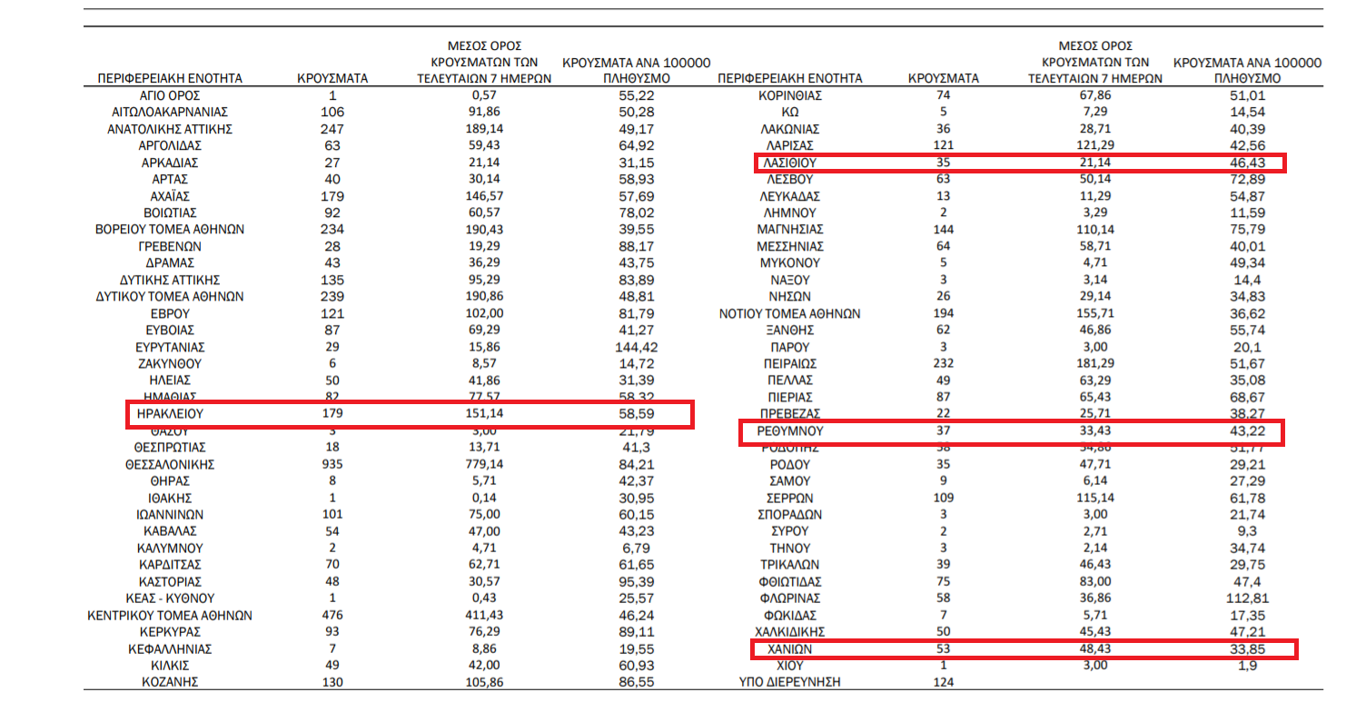 Σύμφωνα με τα στοιχεία της ημερήσιας έκθεσης επιδημιολογικής επιτήρησης τα κρούσματα στην Κρήτη κατανέμονται ως εξής: