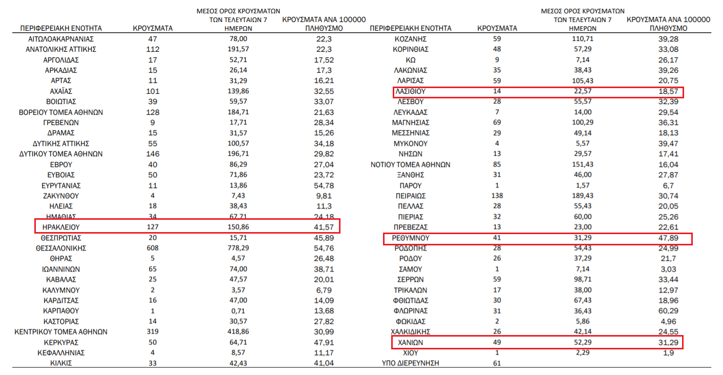 Σύμφωνα με τα στοιχεία της ημερήσιας έκθεσης επιδημιολογικής επιτήρησης τα κρούσματα στην Κρήτη κατανέμονται ως εξής: