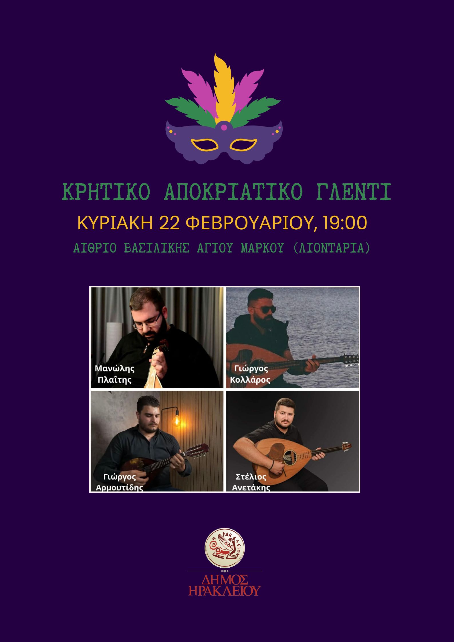 Ειδικότερα, την Κυριακή 22 Φεβρουαρίου, στις 19:00, στα Λιοντάρια, θα πραγματοποιηθεί αποκριάτικο γλέντι με παραδοσιακή κρητική μουσική από τους Μανώλη Πλαΐτη στη λύρα, τον Γιώργο Κολλάρο στο λαούτο, τον Γιώργο Αρμουτίδη στο μαντολίνο και τον Στέλιο Ανετάκη στο λαούτο.