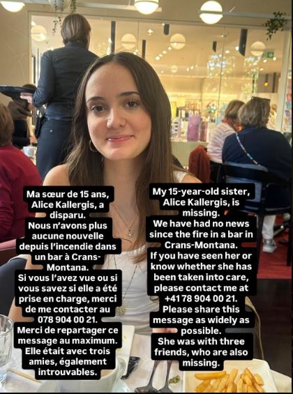 Ελληνίδα μόνιμος κάτοικος Ελβετίας, φέρεται να συγκαταλέγεται μεταξύ των δεκάδων αγνοουμένων από την τραγωδία στο χιονοδρομικό θέρετρο Κραν Μοντανά.