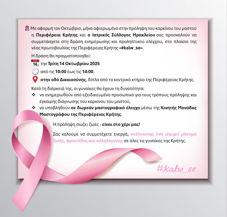 Με αφορμή τον Οκτώβριο, μήνα αφιερωμένο στην πρόληψη του καρκίνου του μαστού, η Περιφέρεια Κρήτης και ο Ιατρικός Σύλλογος Ηρακλείου σας προσκαλεί να συμμετάσχετε στη δράση ενημέρωσης και προληπτικού ελέγχου, στο πλαίσιο της νέας πρωτοβουλίας «#kalw_se».