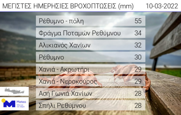 Η νύχτα που πέρασε έφερε στην Κρήτη, μαζί με το καιρικό σύστημα “Φίλιππος”, νέες ισχυρές βροχοπτώσεις, δίνοντας το στίγμα αυτής της ιδιαίτερα βροχερής για το νησί περιόδου, που ωστόσο δεν φτάνει τα επίπεδα του πρώτου διμήνου του 2019, όταν σημειώθηκαν σοβαρά πλημμυρικά φαινόμενα στην ευρύτερη περιοχή της Χερσονήσου και όχι μόνο. Χθες, οι μετεωρολογικοί σταθμοί του Αστεροσκοπείου κατέγραψαν, μεταξύ άλλων, 55 χιλιοστά βροχή στην πόλη του Ρεθύμνου, 34 χιλιοστά στο Φράγμα Ποταμών, 32 χιλιοστά στον Αλικιανό Χανίων, 29 χιλιοστά στο Ακρωτήρι και 28 χιλιοστά στην Ασή Γωνιά και στο Σπήλι.https://www.ertnews.gr/