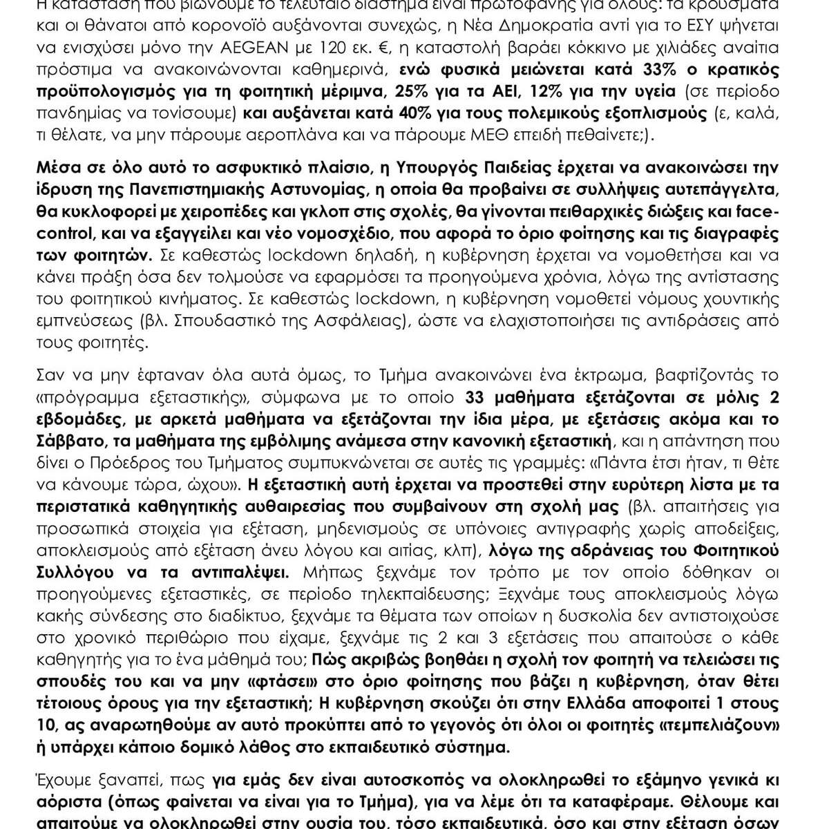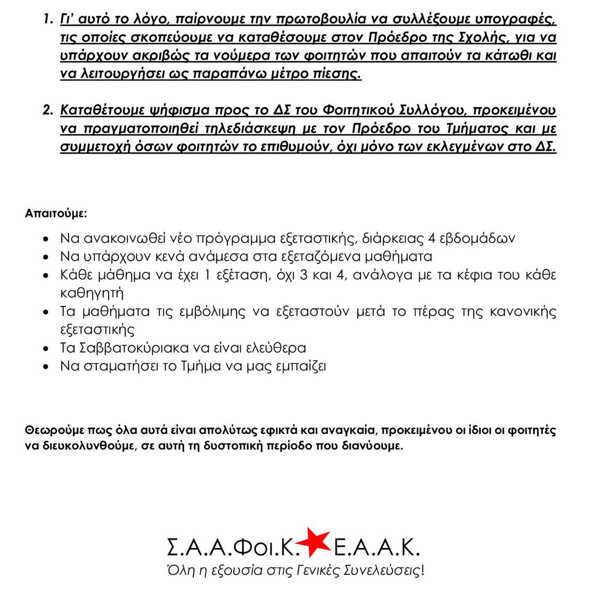 “Για άλλη μια φορά γινόμαστε μάρτυρες της καθηγητικής αυθαιρεσίας που υπάρχει στη σχολή και για ακόμη μία φορά καλούμαστε να ανταπεξέλθουμε σε μία πολύ εντατικοποιημένη εξεταστική”