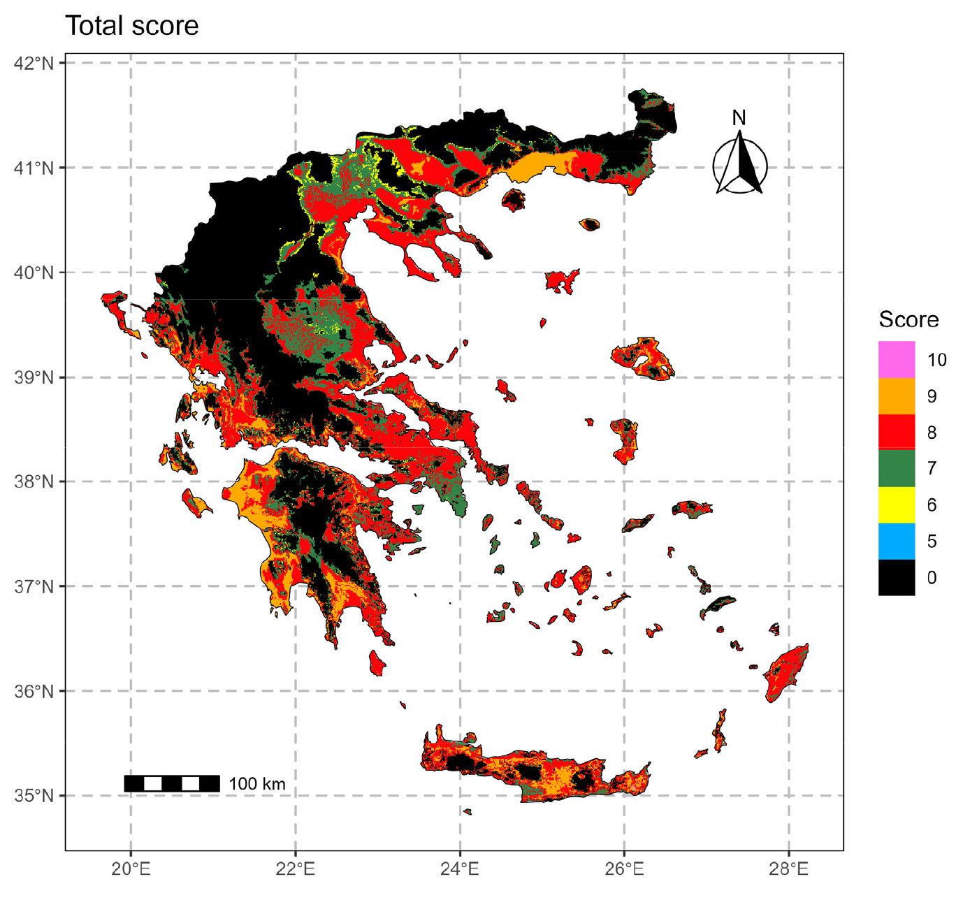 Ο τελικός χάρτης καταλληλότητας ελιάς στην Ελλάδα προκύπτει από τη συνδυαστική προσθήκη γεωμορφολογικών και κλιματικών παραμέτρων. Πολλά σημεία λαμβάνουν βαθμολογία 0 λόγω του συνδυασμού υπερβολικά αρνητικών παραμέτρων. Παρ’ όλα αυτά, εκτεταμένες περιοχές παρουσιάζουν υψηλή συνολική καταλληλότητα. Συνολικά, η Ελλάδα εμφανίζει υψηλό επίπεδο καταλληλότητας, γεγονός που εξηγεί την εκτεταμένη παραγωγή ελιάς, παρά το ότι δεν έχουν ληφθεί υπόψη παράγοντες όπως άρδευση, έδαφος, κόστος εργασίας και κίνδυνοι προσβολών.