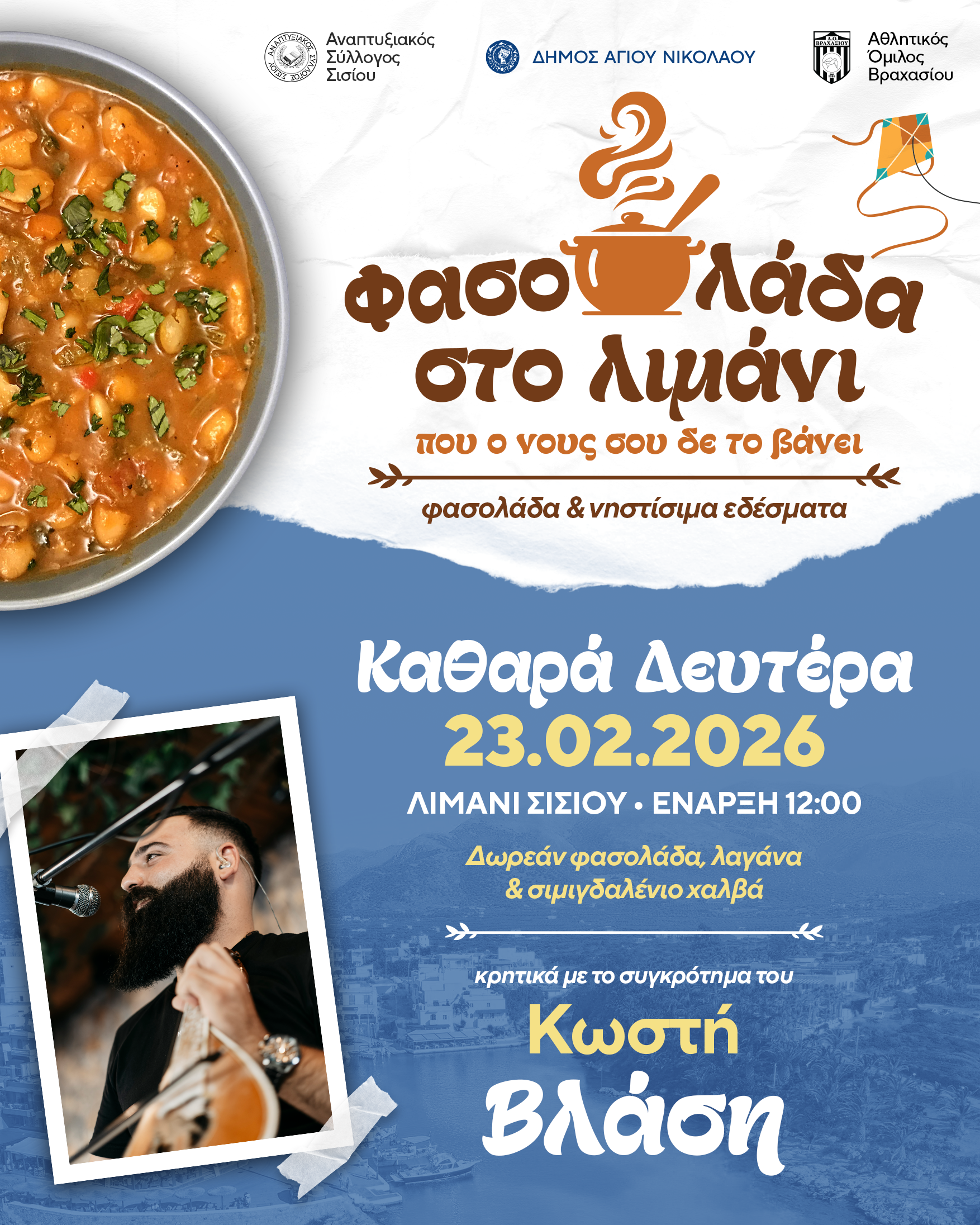 Συγκεκριμένα στο Λιμάνι Σισίου ο Δήμος Αγίου Νικολάου σε συνεργασία με τον Αναπτυξιακό Σύλλογο Σισίου και τον Αθλητικό Όμιλο Βραχασίου διοργανώνουν την καθιερωμένη εκδήλωση «Φασολάδα στο Λιμάνι που ο νους σου δεν το βάνει».
