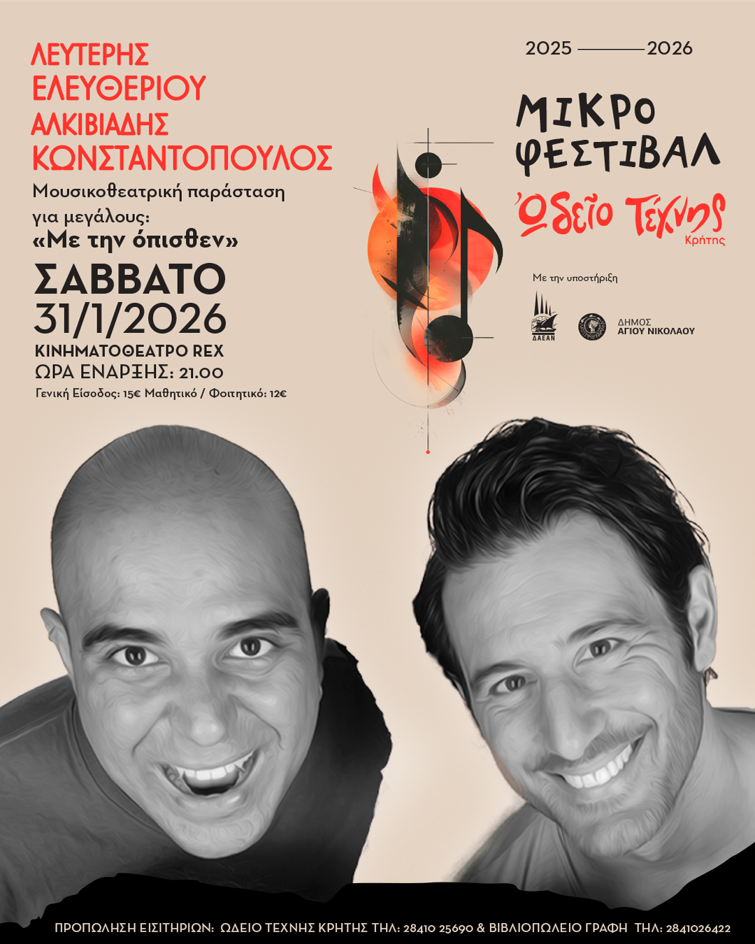 Ο Λευτέρης Ελευθερίου, με το πολυδιάστατο ταλέντο του στην υποκριτική, το τραγούδι και τις μιμήσεις, συναντά τον Αλκιβιάδη Κωνσταντόπουλο, τον γνωστό και ως Άνθρωπο Ορχήστρα, στη μουσικοθεατρική παράσταση «Με την όπισθεν» που θα παρουσιάσουν το Σάββατο 31 Ιανουαρίου 2026 στο Κινηματοθέατρο REX, στο πλαίσιο του «Μικρού Φεστιβάλ» που διοργανώνει το Ωδείο Τέχνης Κρήτης και υποστηρίζει ο Δήμος Αγίου Νικολάου μέσω της Δημοτικής Ανώνυμης Εταιρείας Αγίου Νικολάου (Δ.Α.Ε.Α.Ν.).
