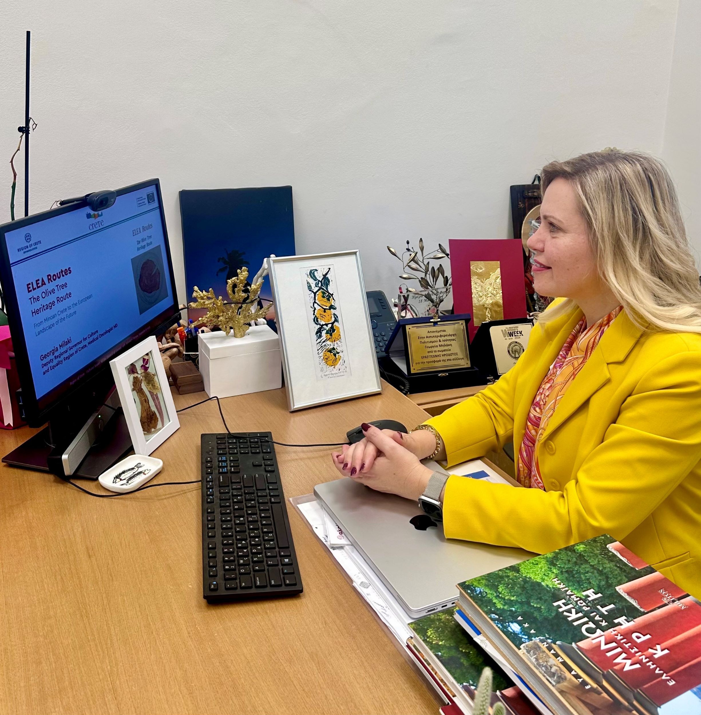 Στο πλαίσιο των εργασιών η Αντιπεριφερειάρχης Πολιτισμού Κρήτης, Γεωργία Μηλάκη, παρουσίασε με διαδικτυακή συμμετοχή την πρόταση-ορόσημο της Κρήτης για τη δημιουργία της Πολιτιστικής Διαδρομής “Elea Heritage Route”, αφού προηγουμένως η Προϊσταμένη του Τμήματος Διεθνών Σχέσεων του Υπουργείου Πολιτισμού Μαριάνθη Αναστασιάδου, ενημέρωσε τους εκπροσώπους των κρατών μελών του Συμβουλίου της Ευρώπης για την πρωτοβουλία της νέας πολιτιστικής διαδρομής.