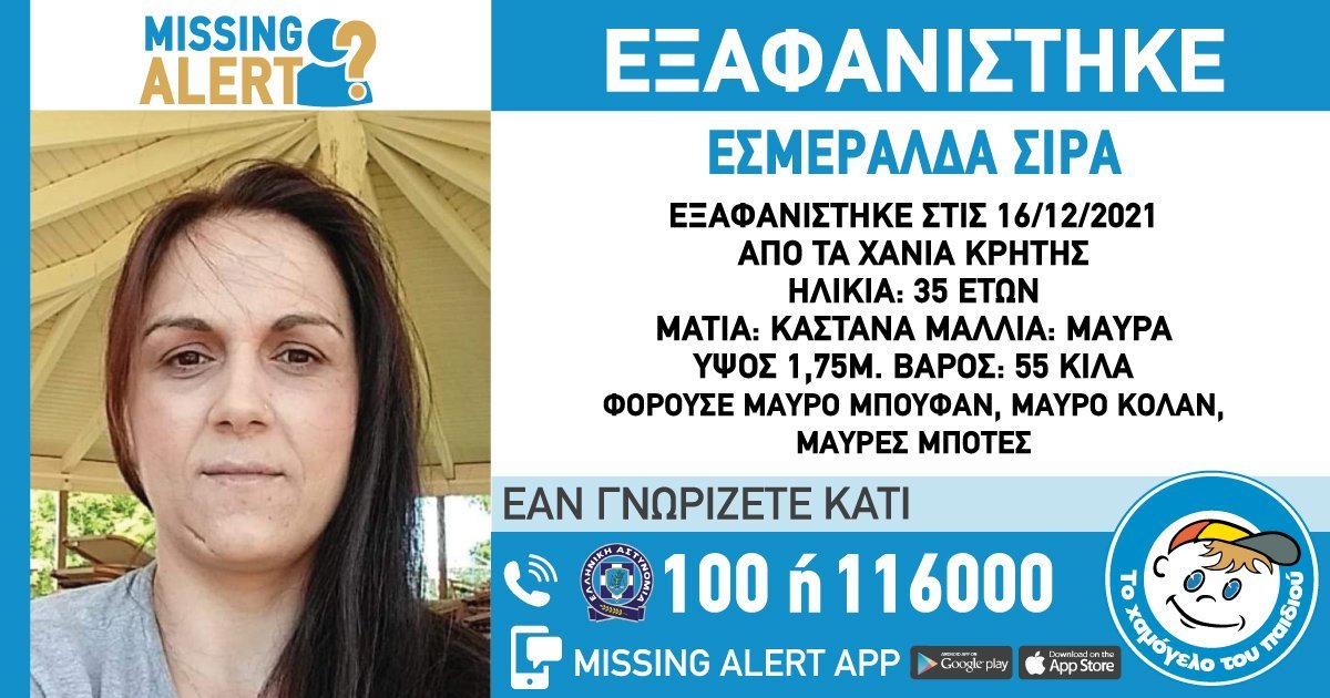 “Στις 16/12/2021, εξαφανίστηκε από την περιοχή των Χανίων, η κυρία Εσμεράλδα Σίρα ,35 ετών. Το «Χαμόγελο του Παιδιού» ενημερώθηκε για την εξαφάνιση της κυρίας Εσμεράλδα Σίρα στις 18/12/2021 και προχώρησε στη δημοσιοποίηση των στοιχείων της ενήλικης κατόπιν αιτήματος της οικογένειας της, καθώς ενδέχεται να συντρέχουν λόγοι οι οποίοι θέτουν τη ζωή της σε κίνδυνο.