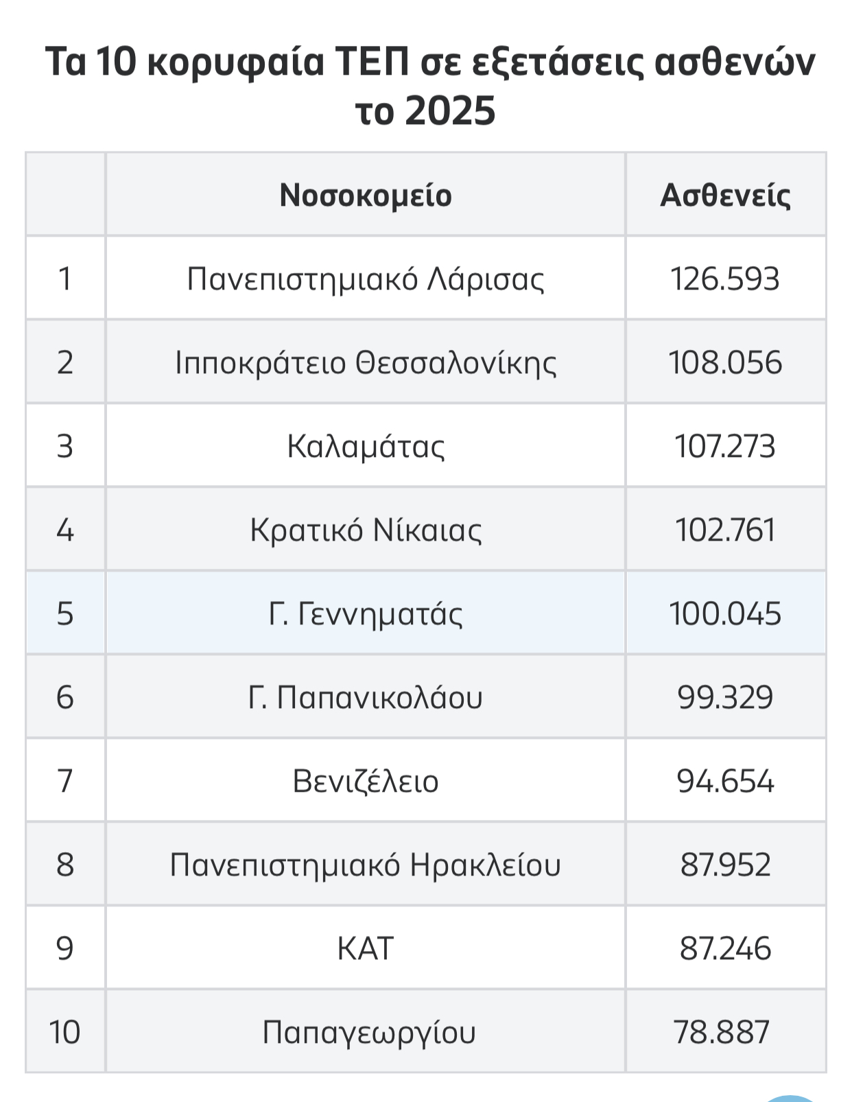 Σχεδόν 100.000 άνθρωποι καταφεύγουν ετησίως στο Τμήμα Επειγόντων Περιστατικών που το κατατάσσουν 1ο στην Κρητη και 7ο στα 10 πρώτα νοσοκομεία με τη μεγαλύτερη κίνηση στην Ελλάδα σύμφωνα με τα επίσημα στοιχεία του Υπουργείου Υγείας για το 2025.