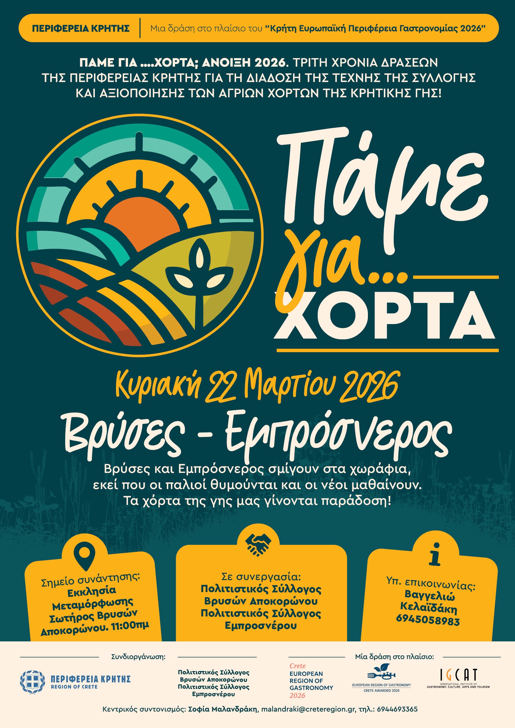 Η Περιφέρεια Κρήτης – Περιφερειακή Ενότητα Χανίων, σε συνεργασία με τοπικούς συλλόγους και φορείς, αναγνωρίζοντας την αξία των άγριων χόρτων, διοργανώνει για τρίτη συνεχή χρονιά το βιωματικό πρόγραμμα δράσεων «Πάμε για… χόρτα», με στόχο τη διάδοση της τέχνης της συλλογής και αξιοποίησής τους. Η δράση εντάσσεται, ήδη από το 2025, στο έργο «Κρήτη – Ευρωπαϊκή Περιφέρεια Γαστρονομίας 2026».