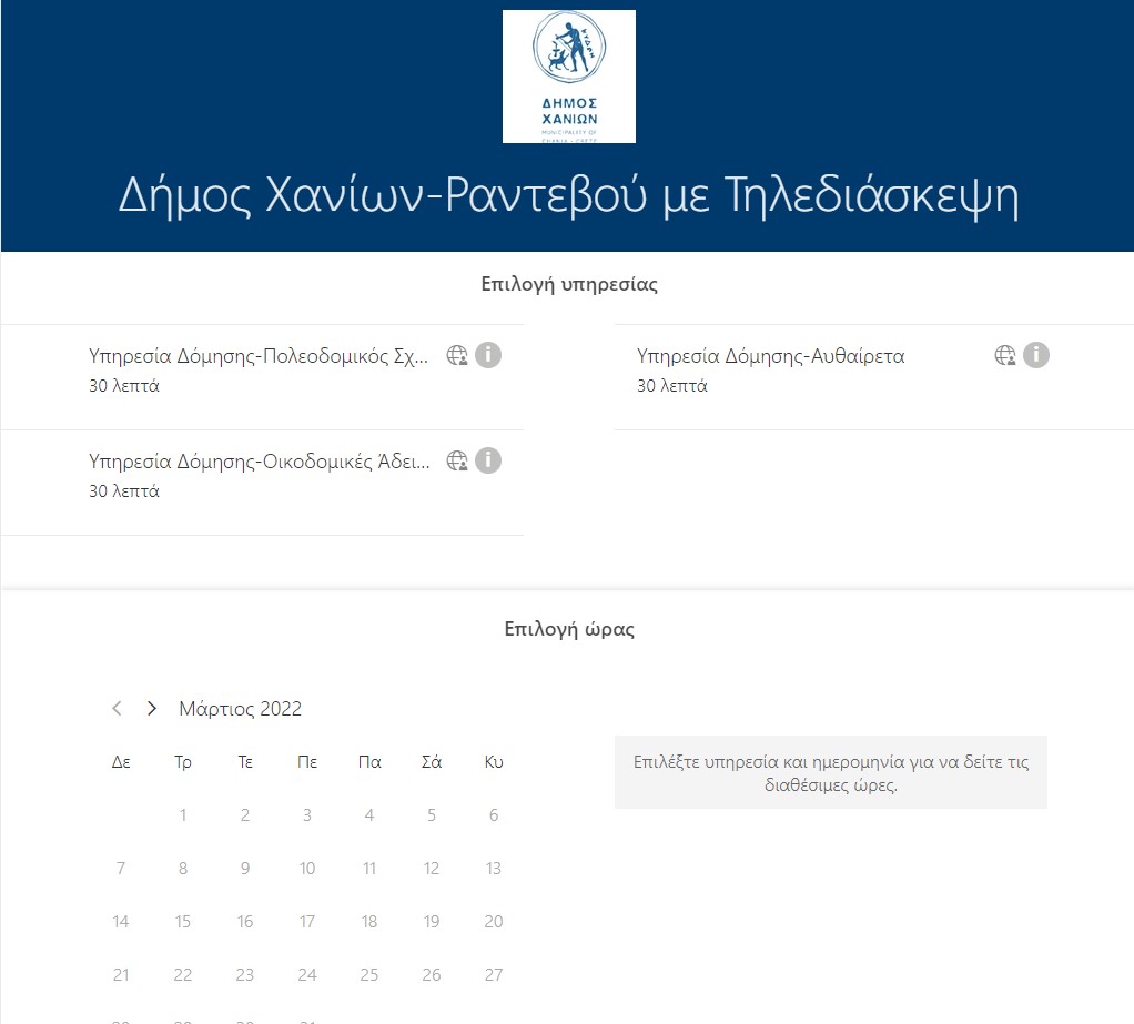 Ο πολίτης εισερχόμενος στην πλατφόρμα ΜyDimos.Live.gov.gr, έχει τη δυνατότητα, μέσω των κωδικών Taxisnet, να προγραμματίζει ψηφιακά ραντεβού με τα στελέχη της Υπηρεσίας Δόμησης (ΥΔΟΜ) – Πολεοδομία του Δήμου Χανίων, είτε με φυσική παρουσία, είτε με τηλεφωνική επικοινωνία είτε με τηλεδιάσκεψη, επιλέγοντας την ημέρα και ώρα από τη λίστα των διαθέσιμων ραντεβού.